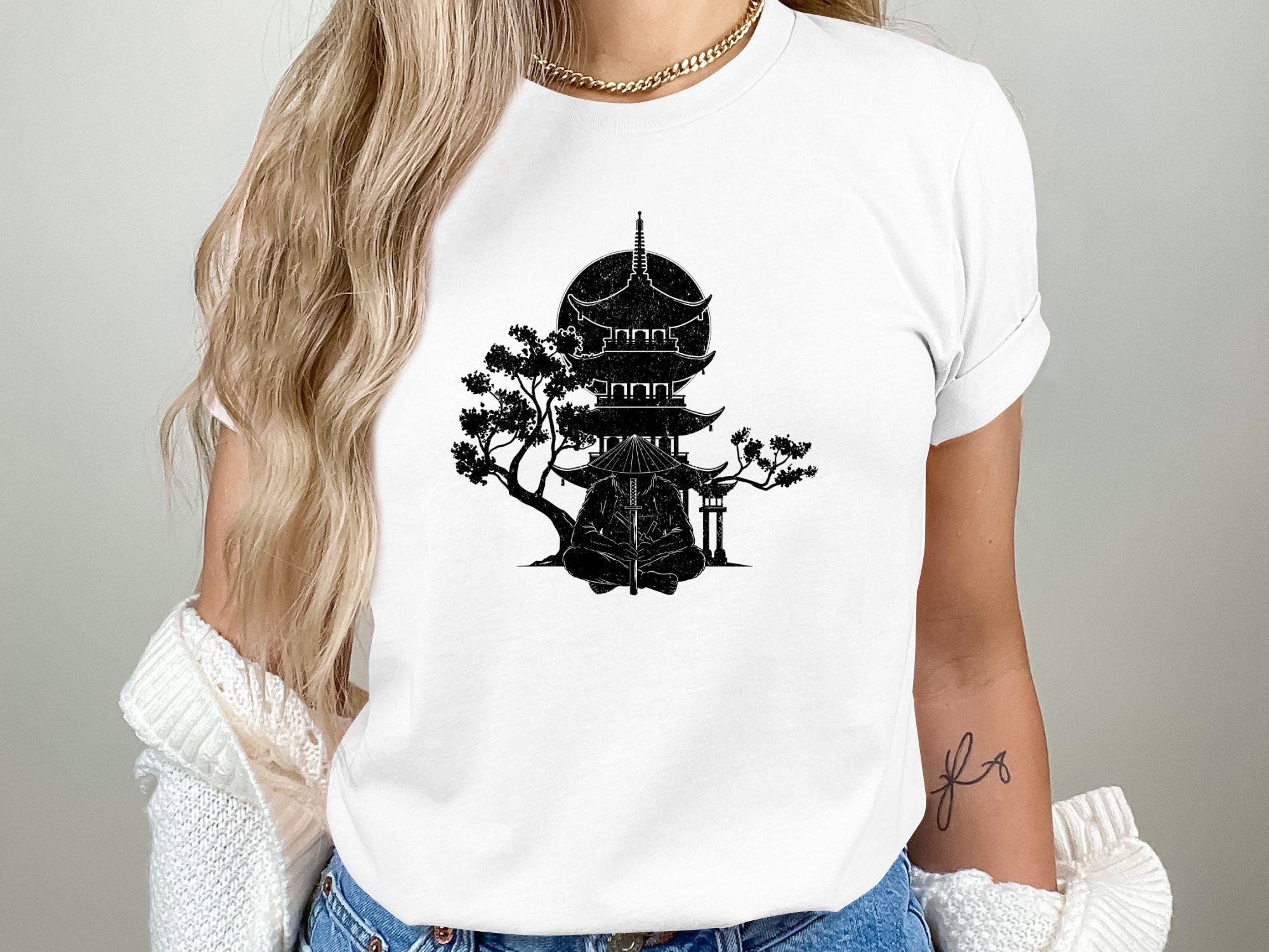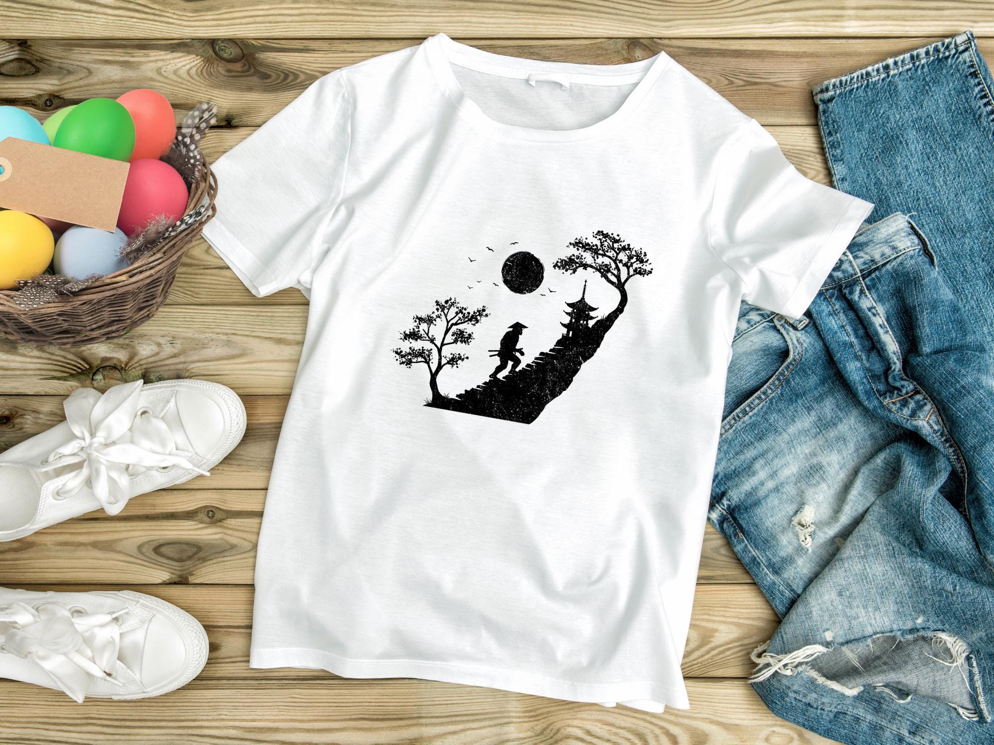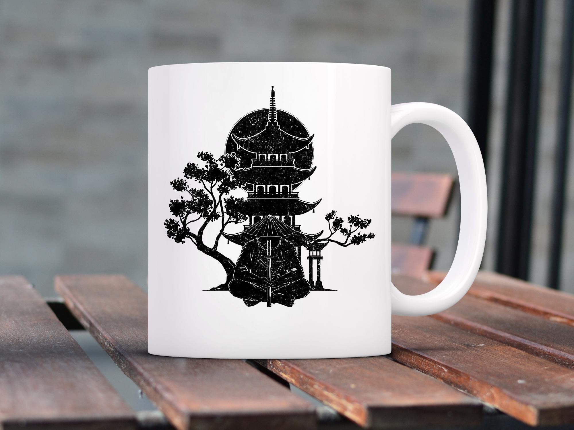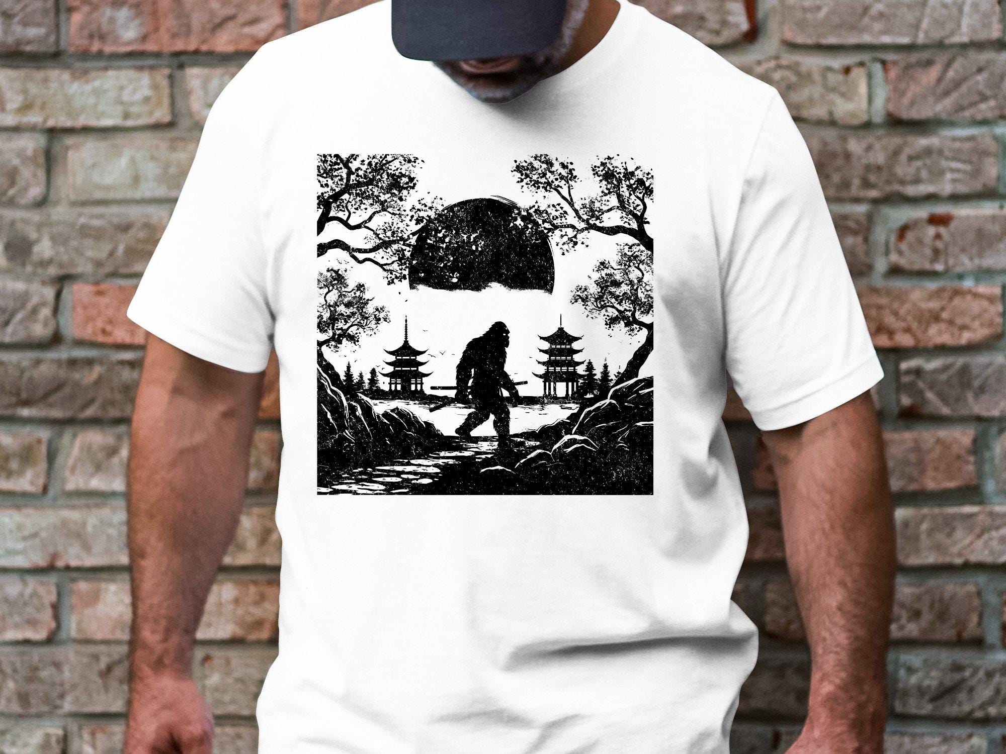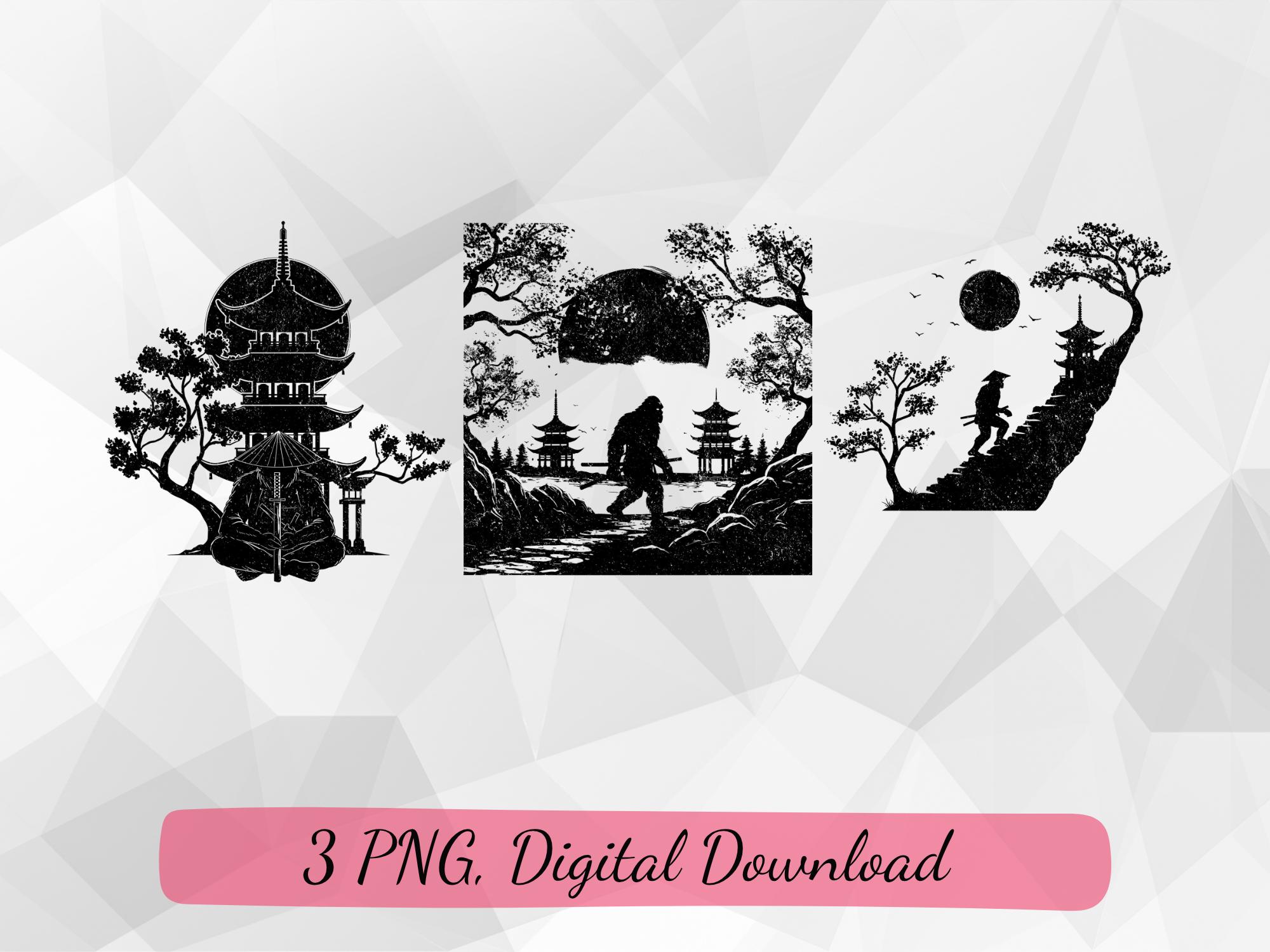 “Bigfoot Samurai Silhouette” PNG featuring a bold Sasquatch warrior with katana swords walking through an oriental landscape with temples, moon, and trees. Perfect for sublimation, shirts, mugs, posters, and crafting projects.