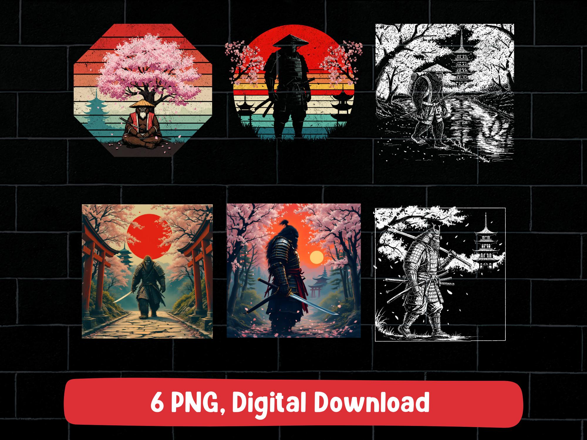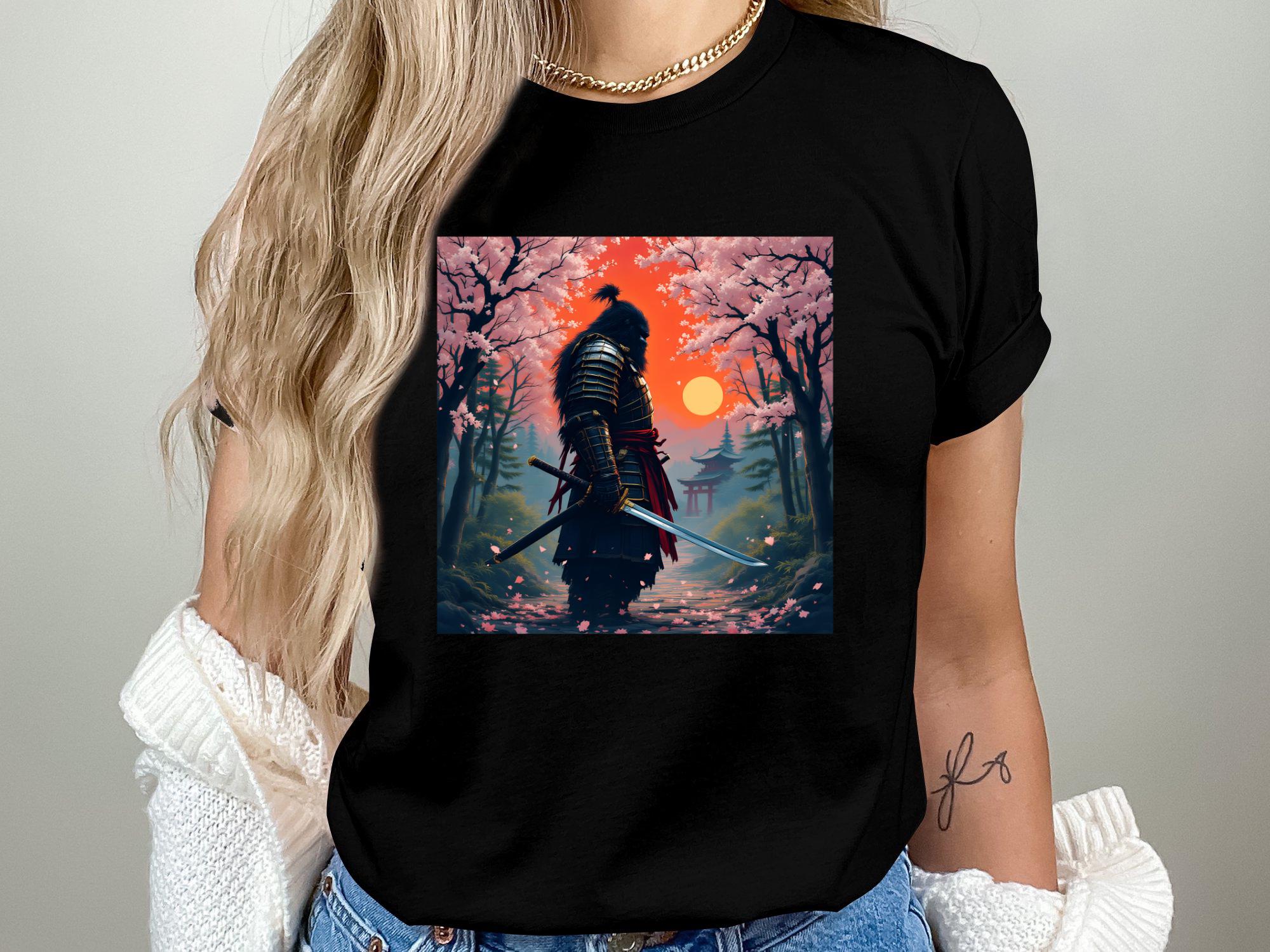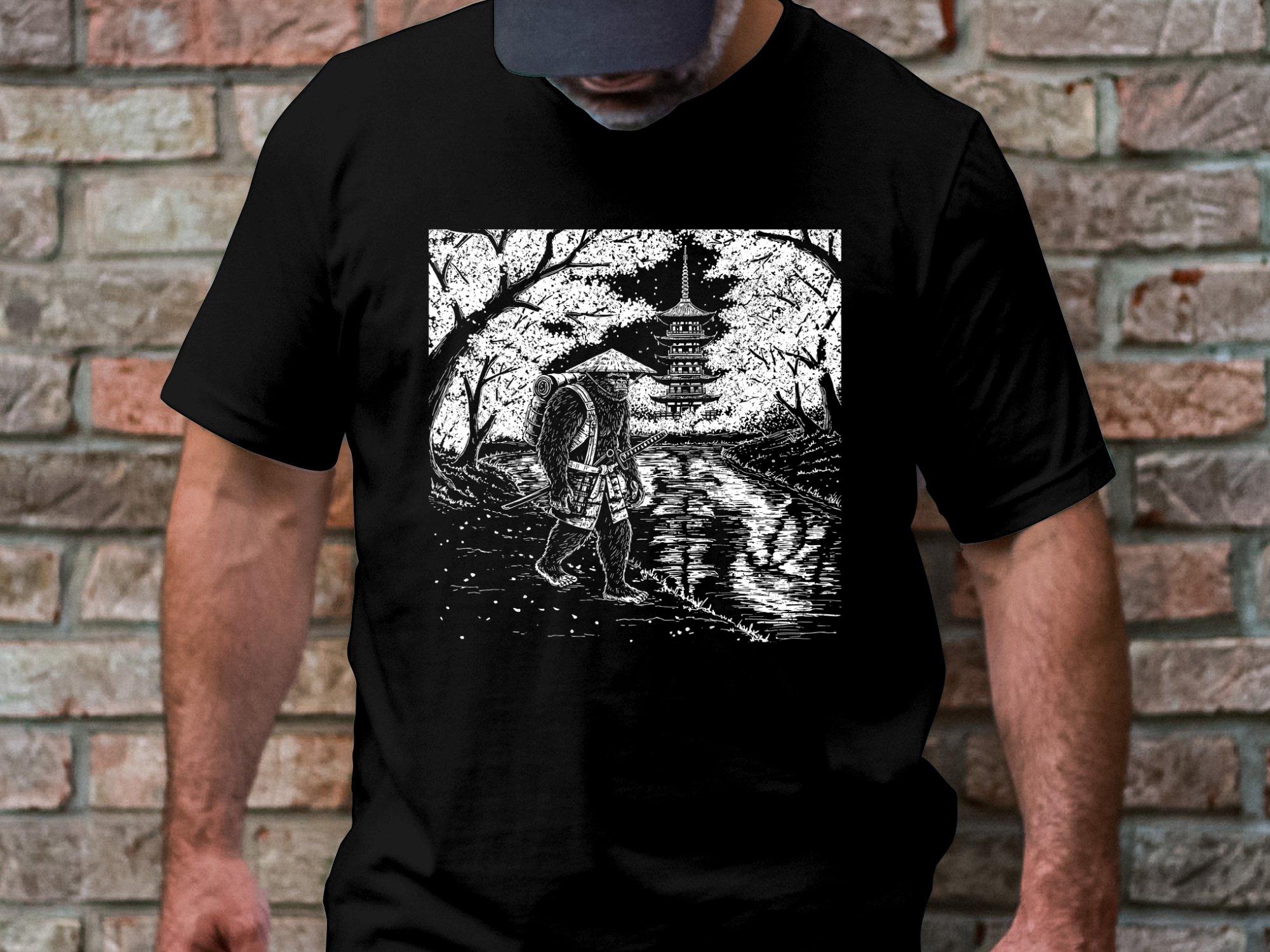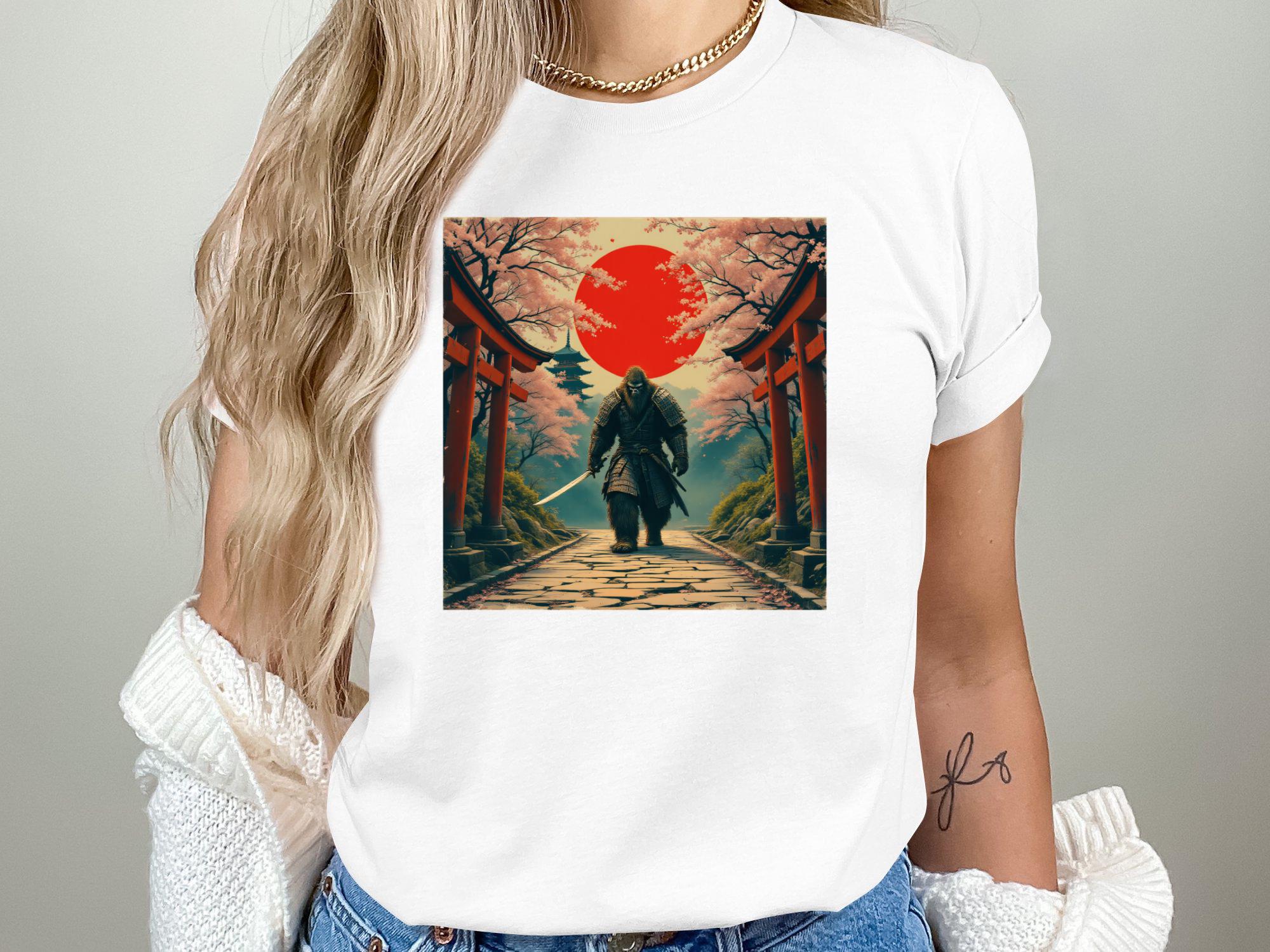 Bigfoot Samurai Japan PNG featuring a powerful Sasquatch warrior in samurai armor walking through cherry blossom gates with a red sun and temple background. Perfect for sublimation, shirts, mugs, posters, crafting projects, and digital designs.