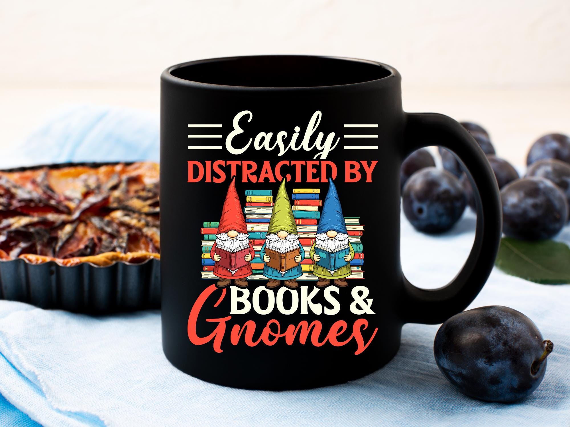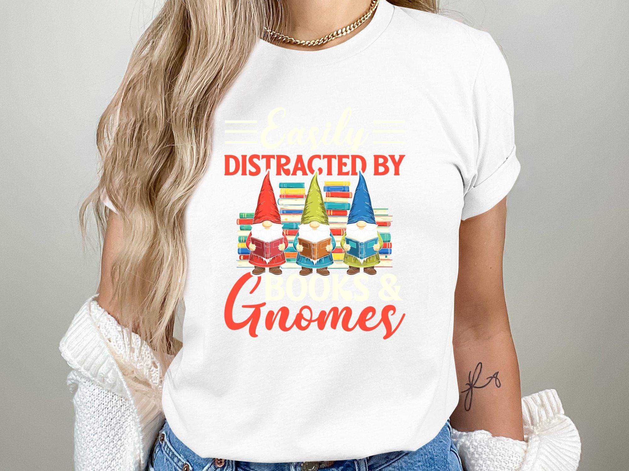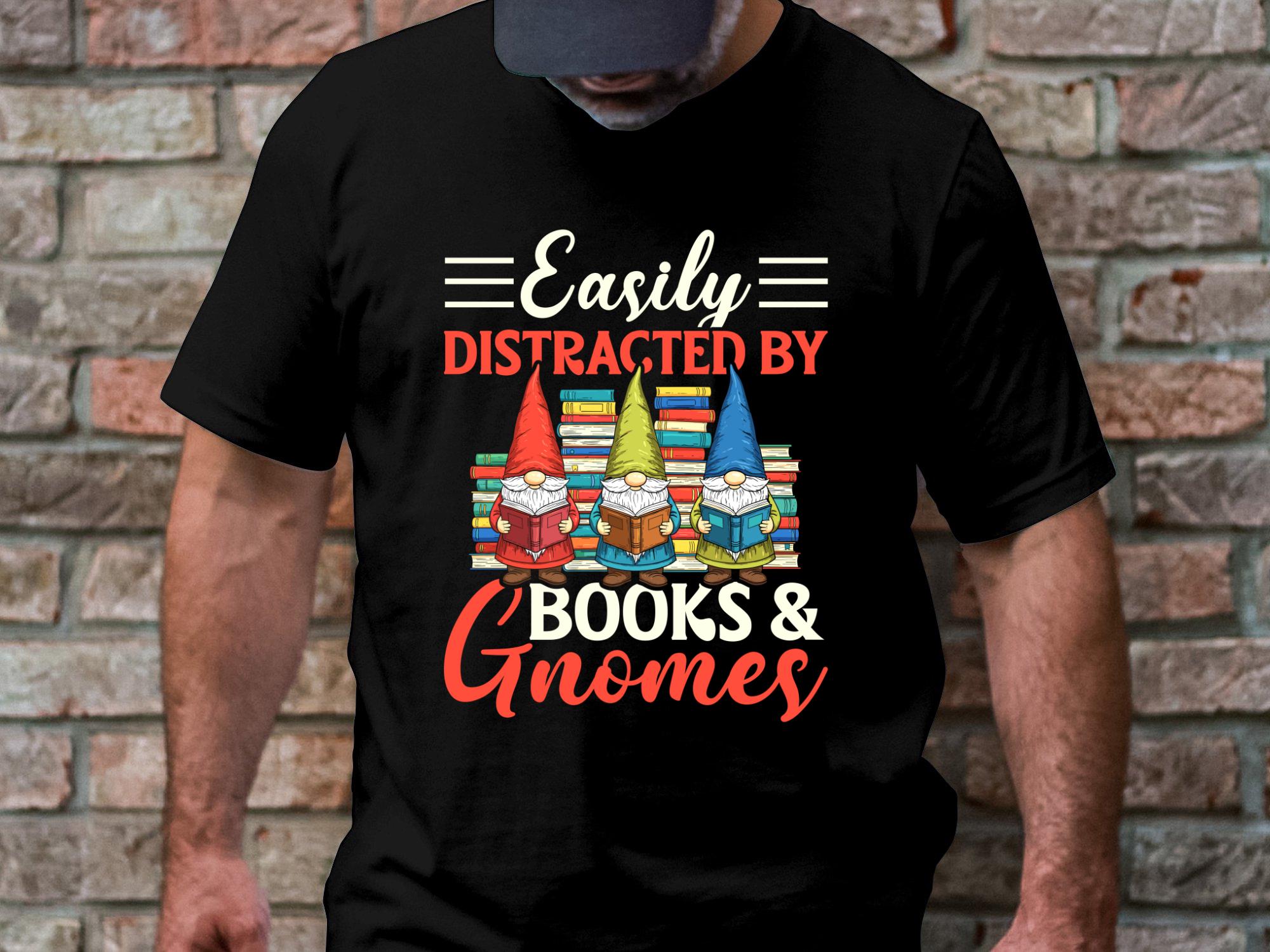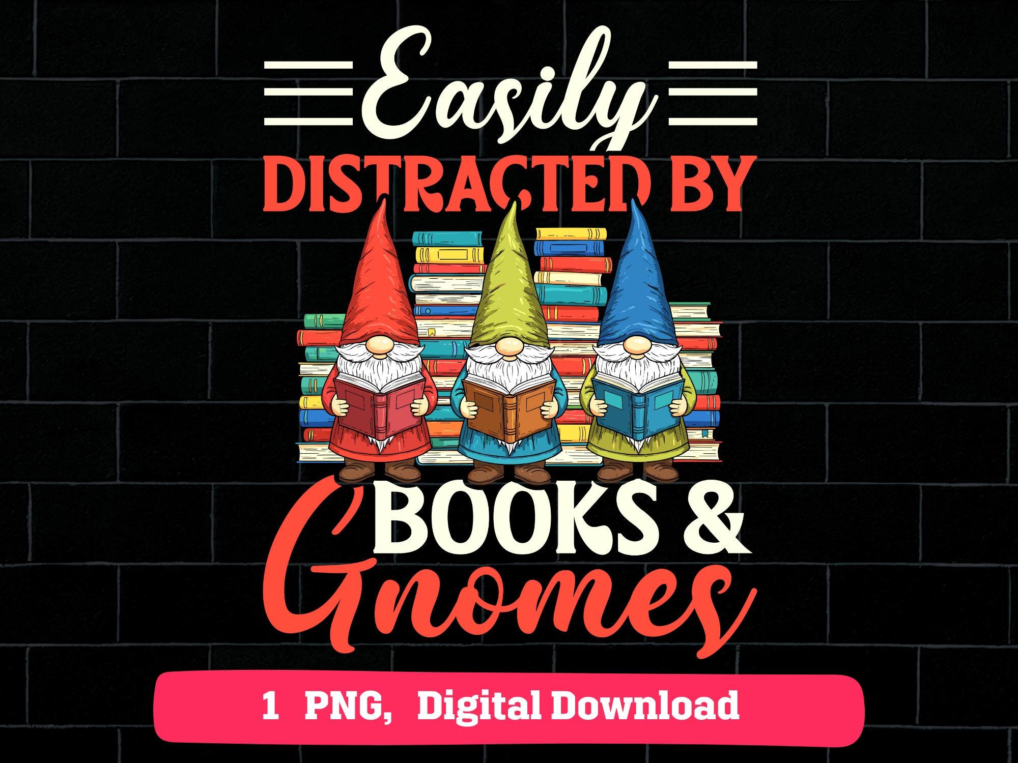 "Easily Distracted by Books & Gnomes" reading gnome artwork for book lovers, teachers, librarians and cozy reading themes. High-resolution PNG for sublimation and crafts.