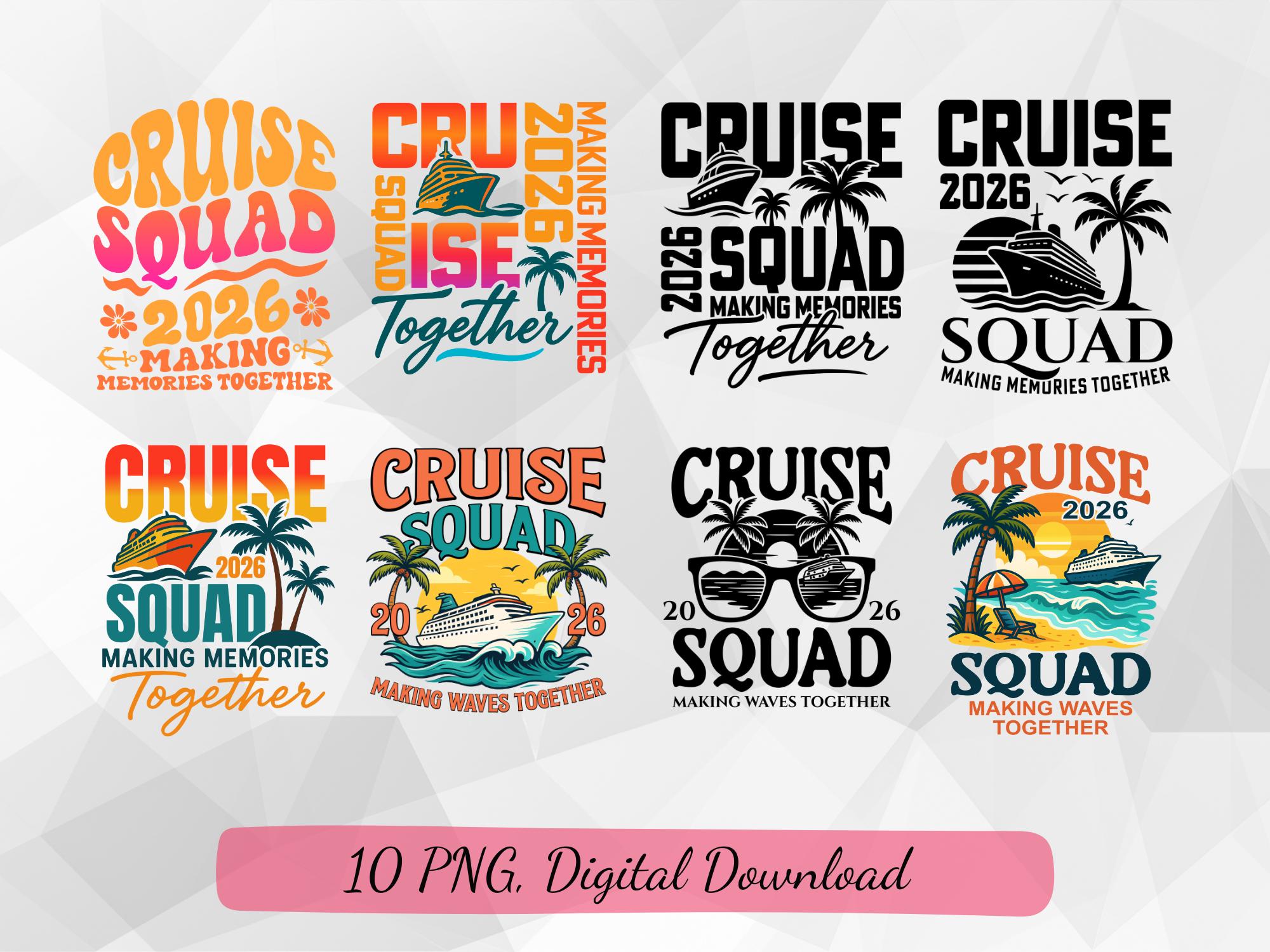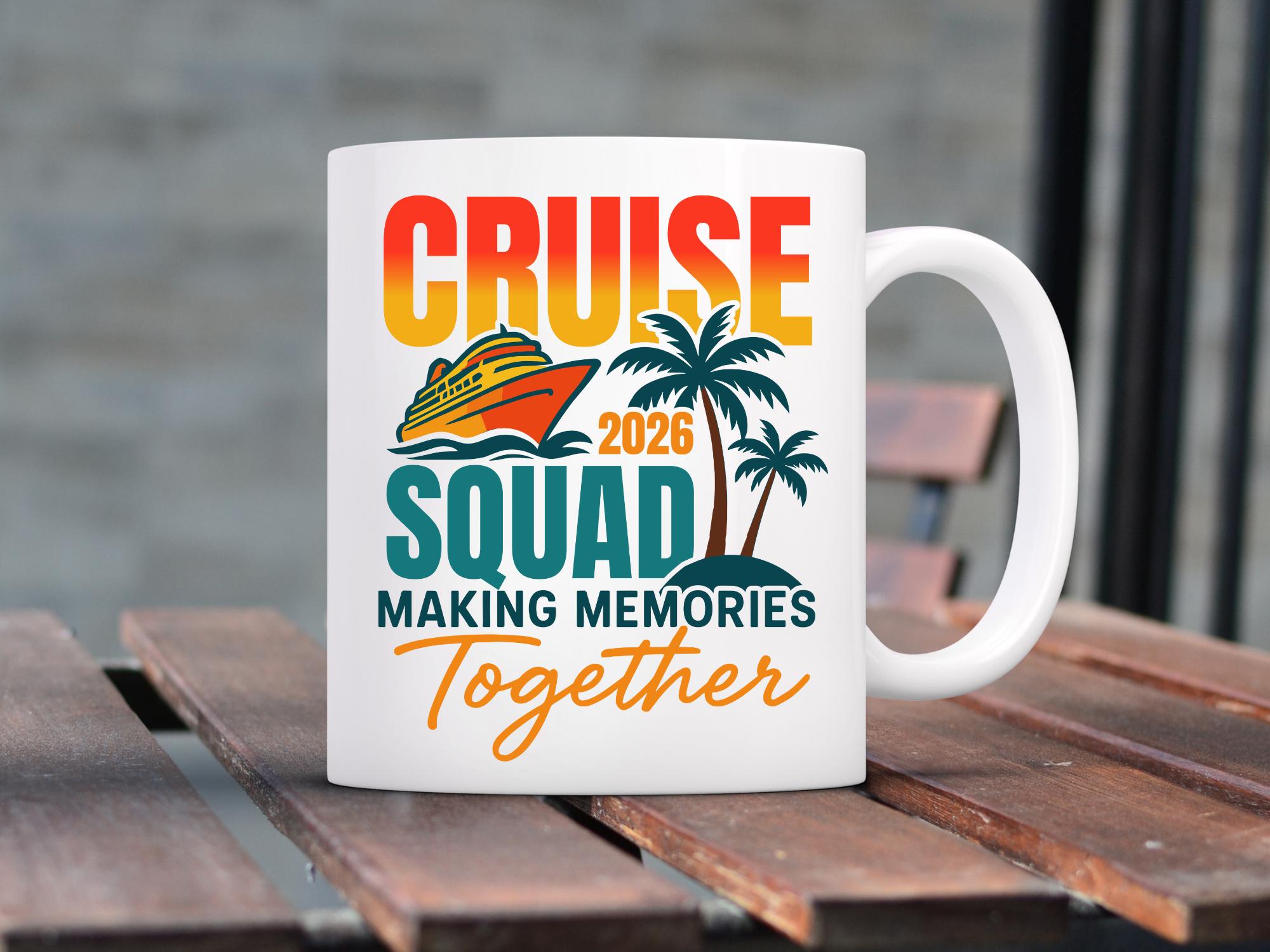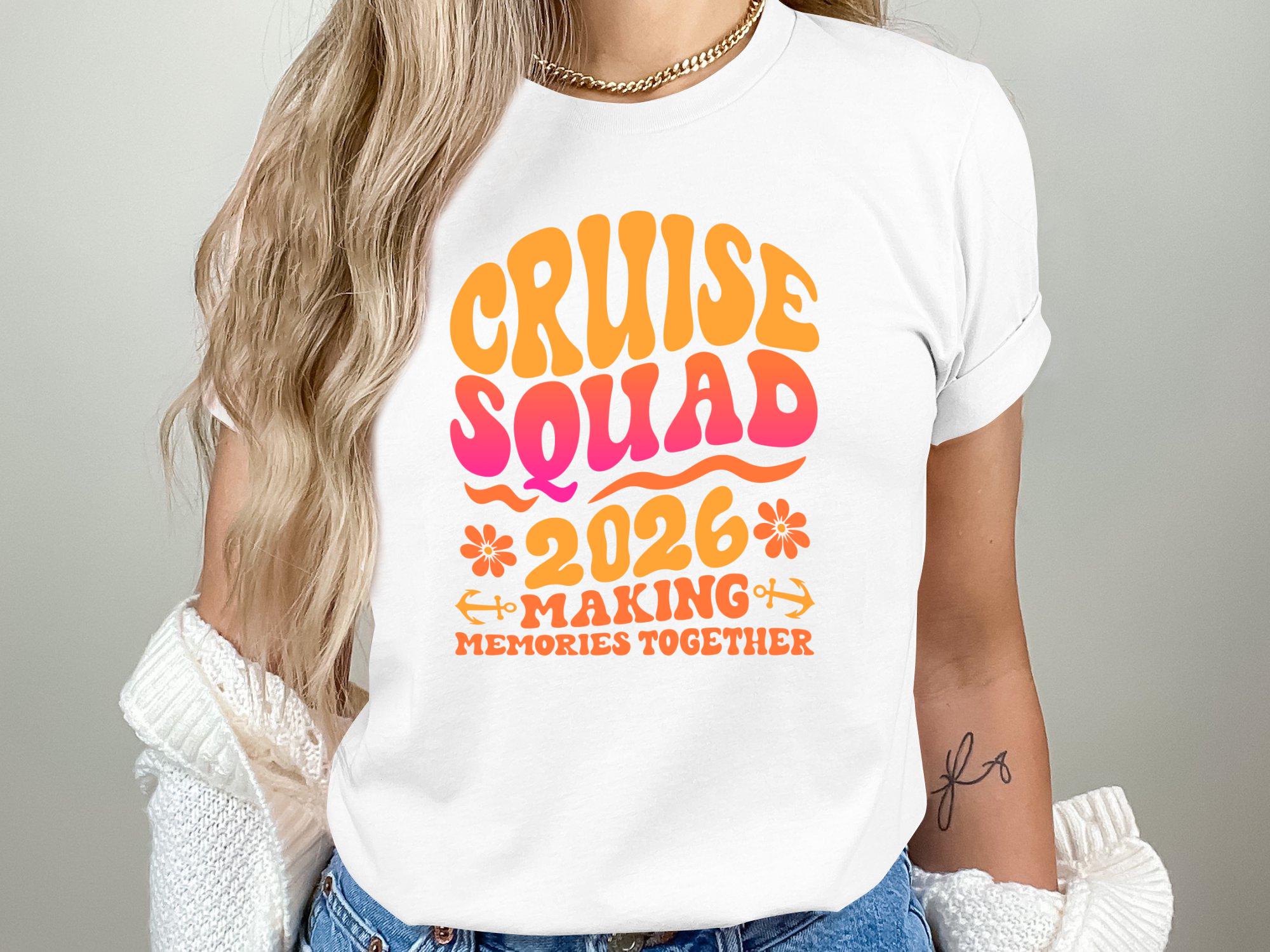 Cruise Squad 2026 Making Memories Together is a colorful tropical vacation artwork featuring a cruise ship, palm trees and sunset vibes, perfect for cruise groups, family trips, friends travel and cruise party decorations.