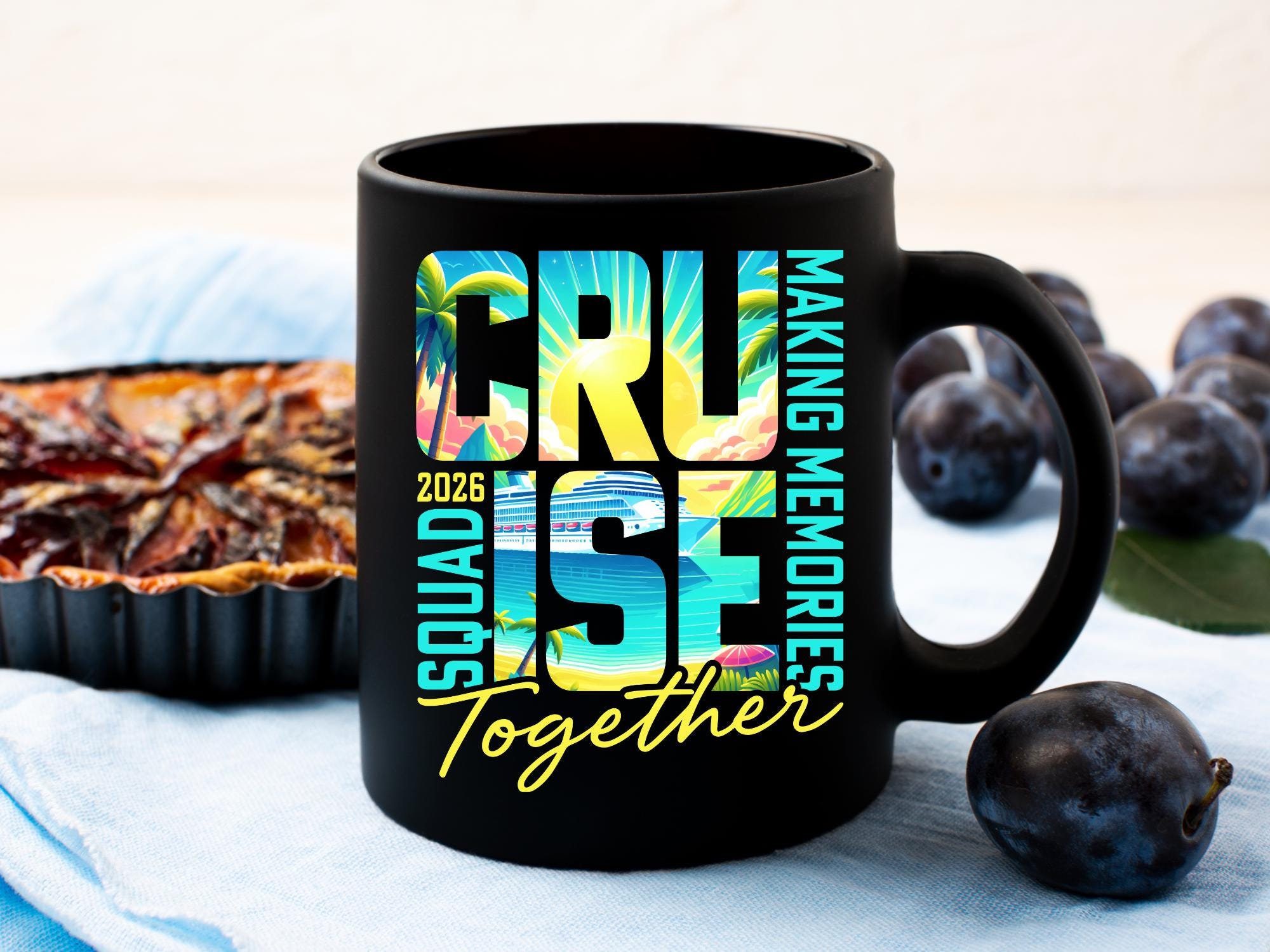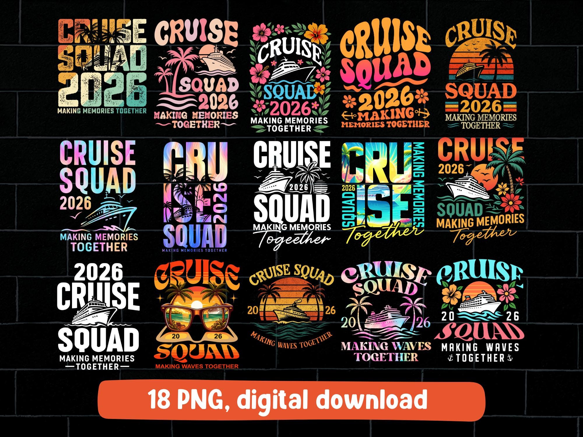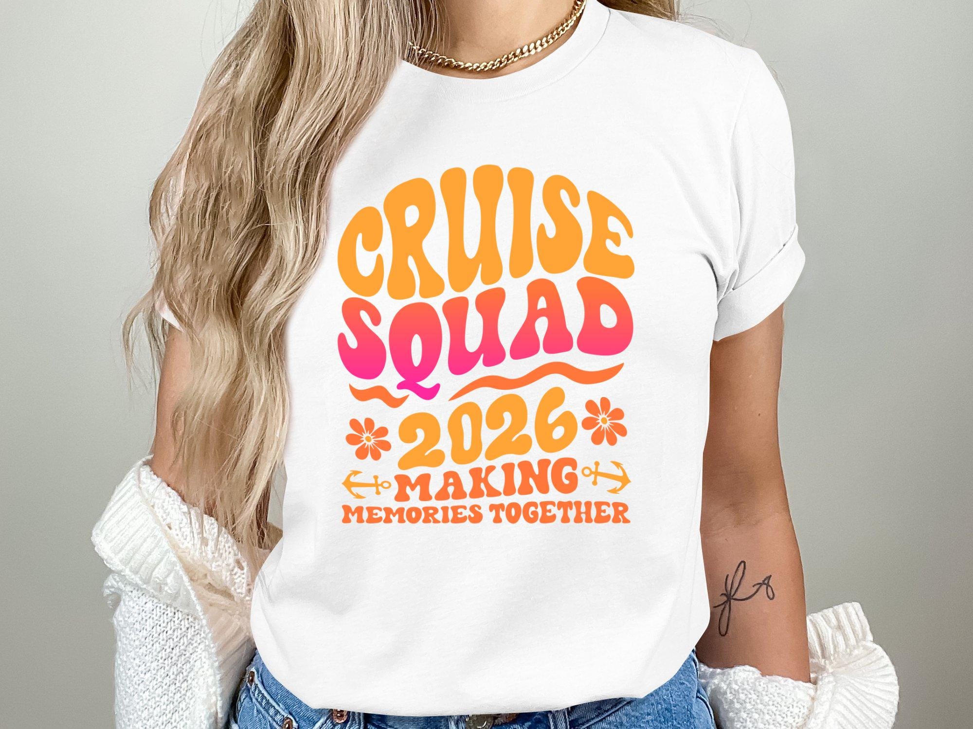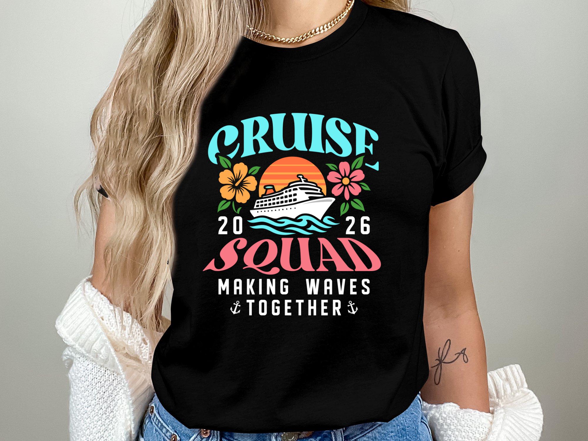 Cruise Squad 2026 Making Memories Together is a vibrant tropical cruise artwork featuring a ship, palm trees and sunset colors, perfect for cruise trips, family vacations, friends groups and cruise party creations.