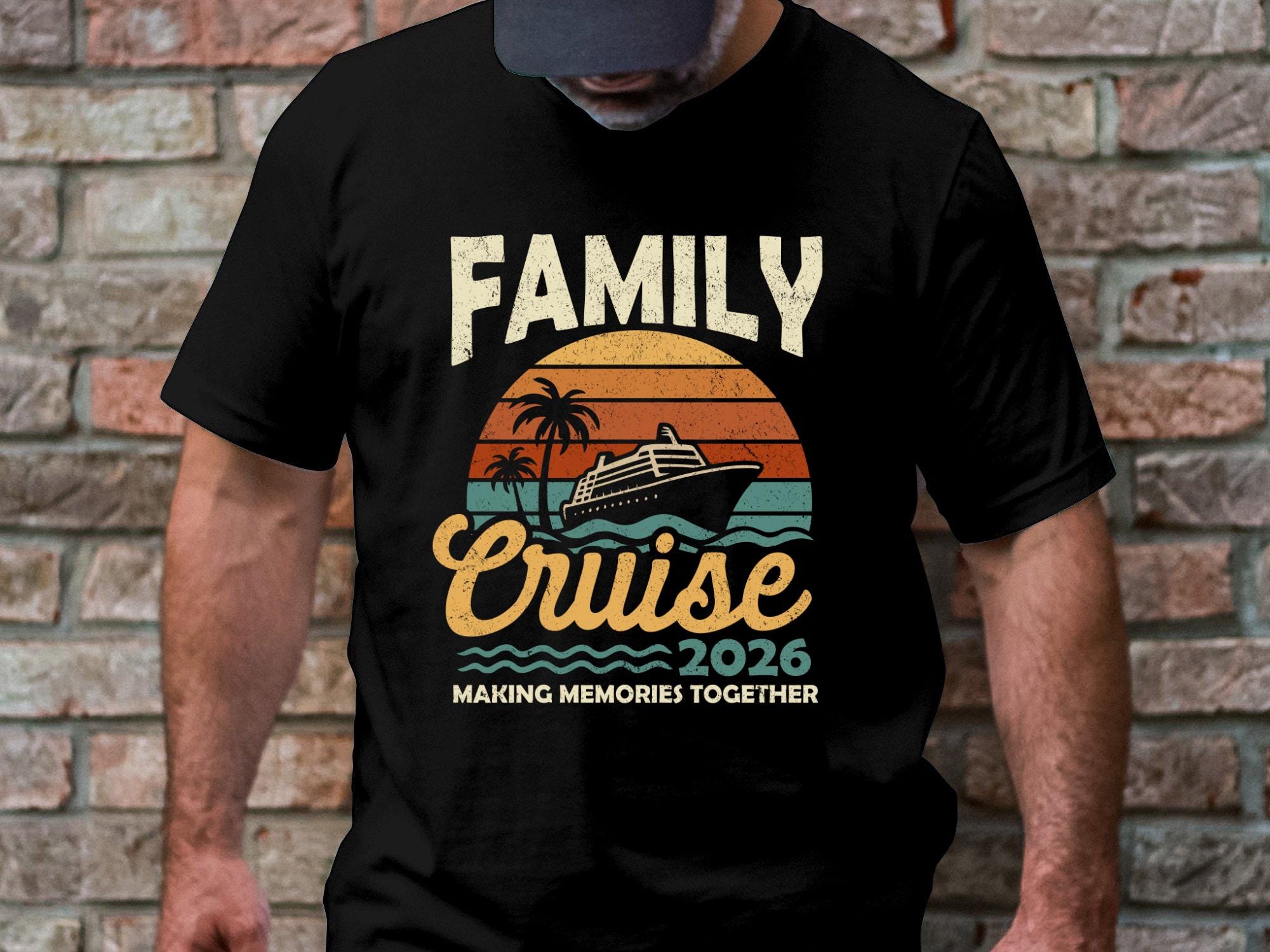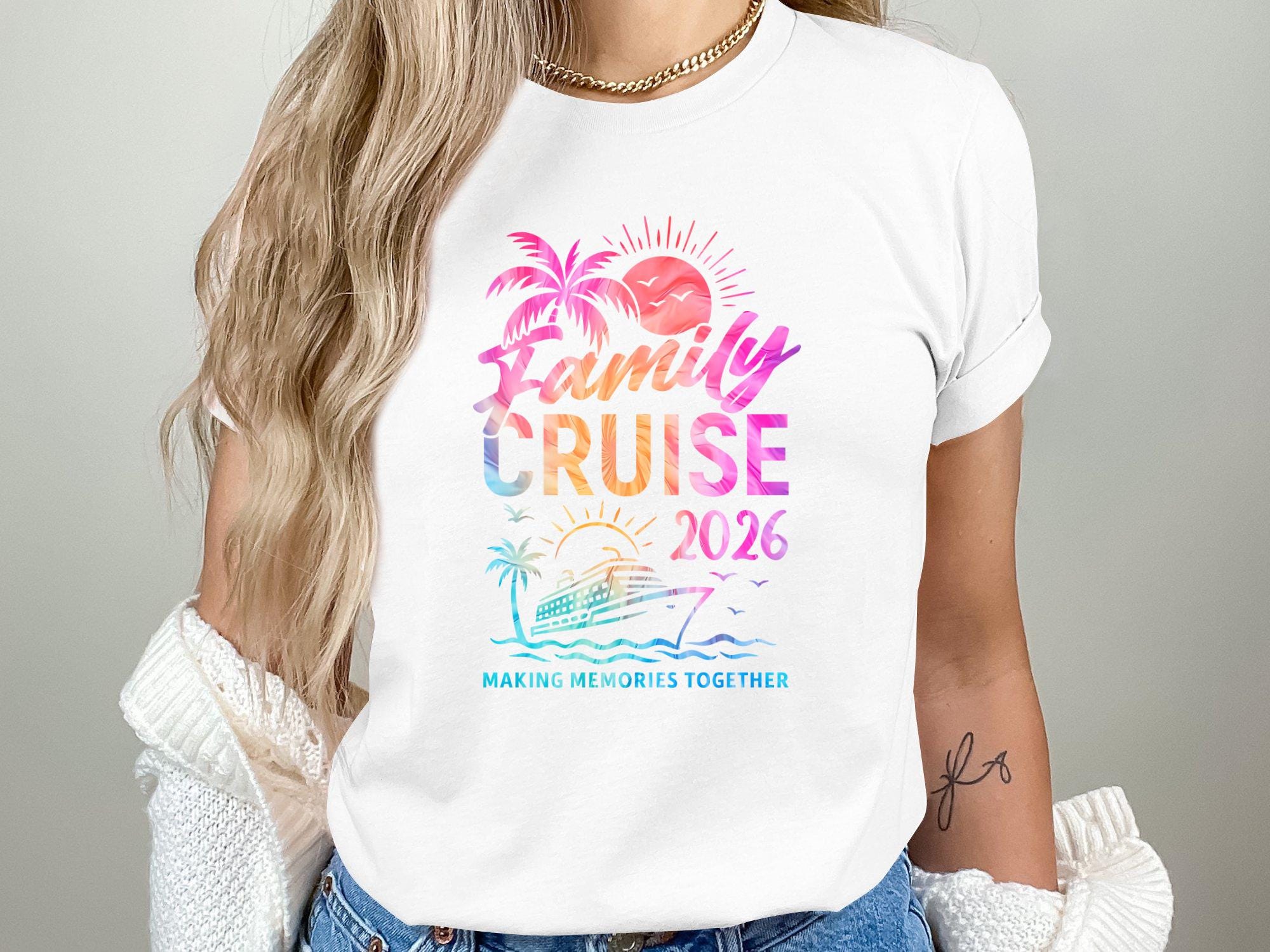 Cruise Family 2026 tropical sunset artwork with ship and palm trees featuring the quote “Cruise Family Making Memories Together 2026” perfect for mugs, shirts, tumblers, stickers and family cruise party projects.