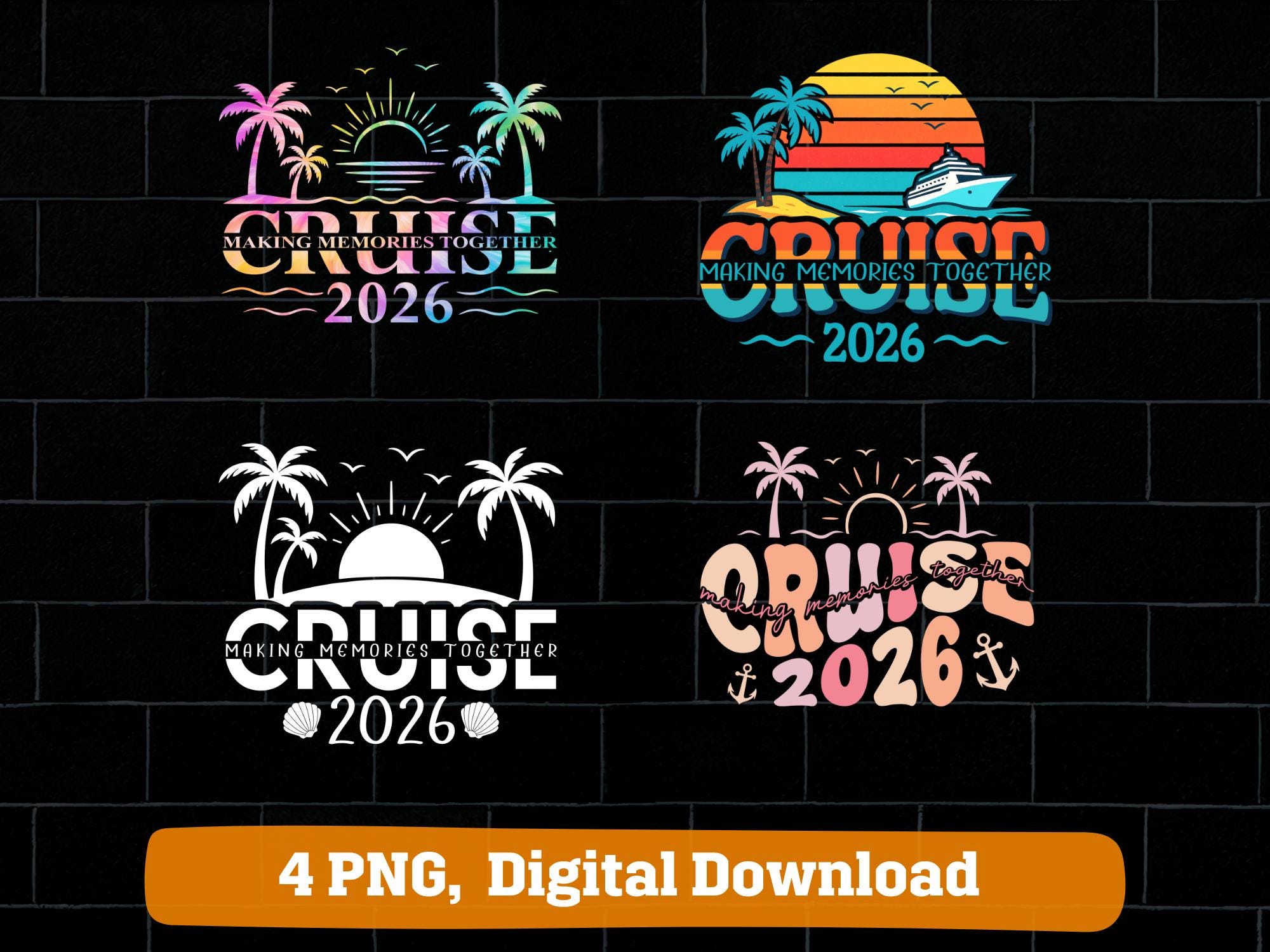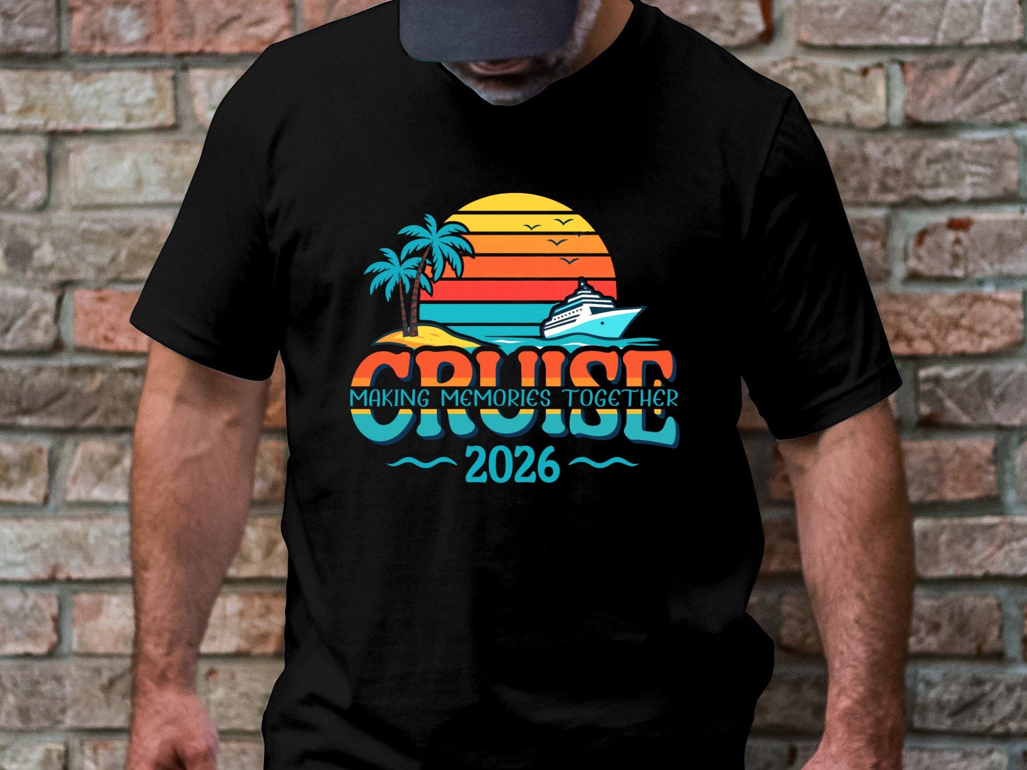 Cruise 2026 tropical sunset artwork with palm trees and ship featuring the quote “Cruise Making Memories Together 2026” perfect for cruise shirts, mugs, tumblers, family trips and vacation party projects.