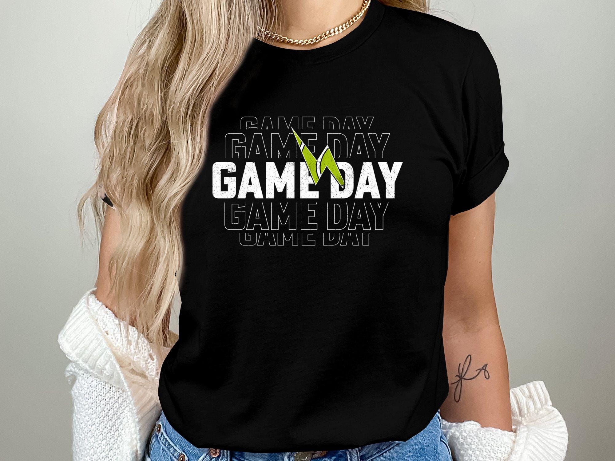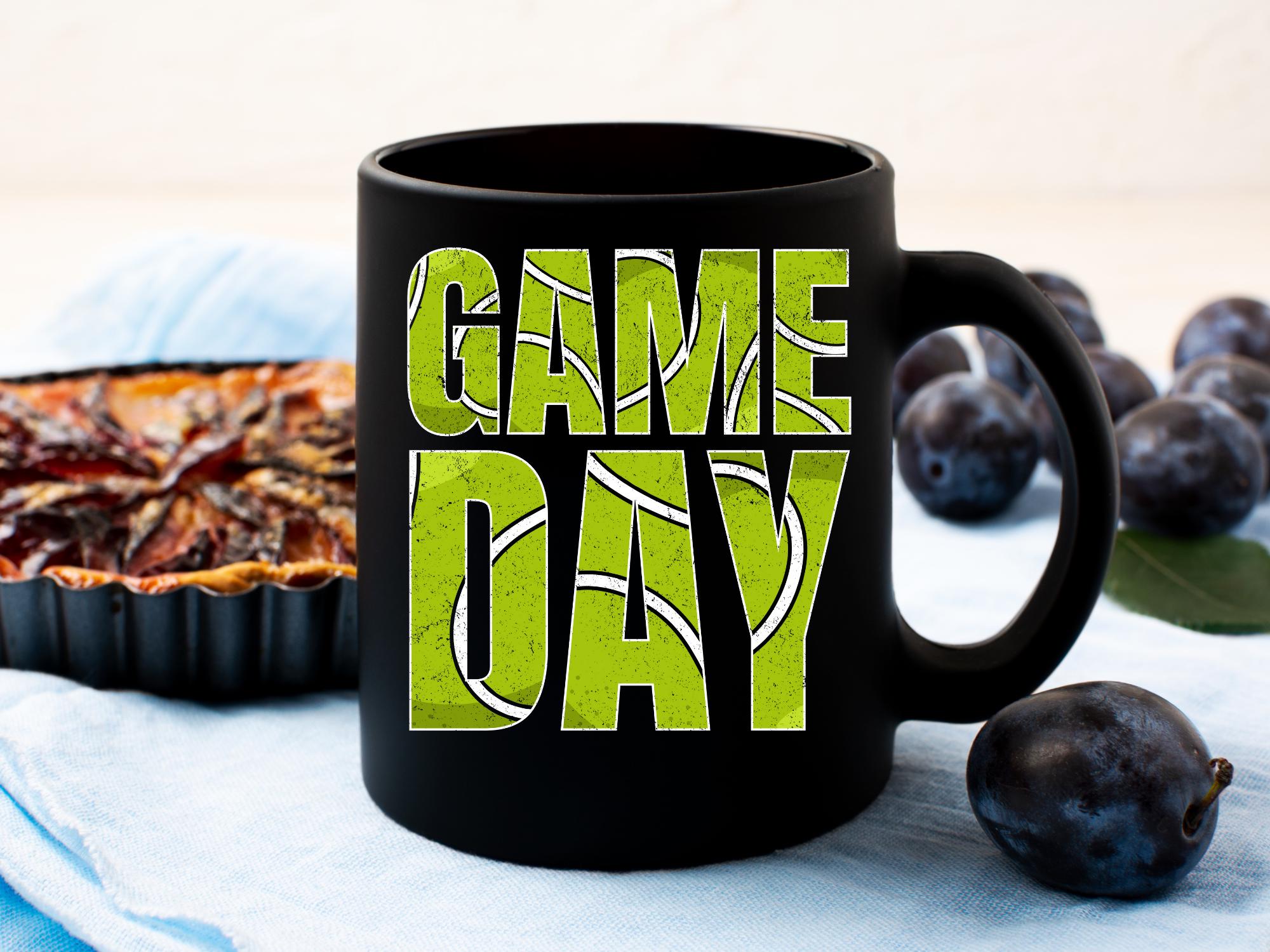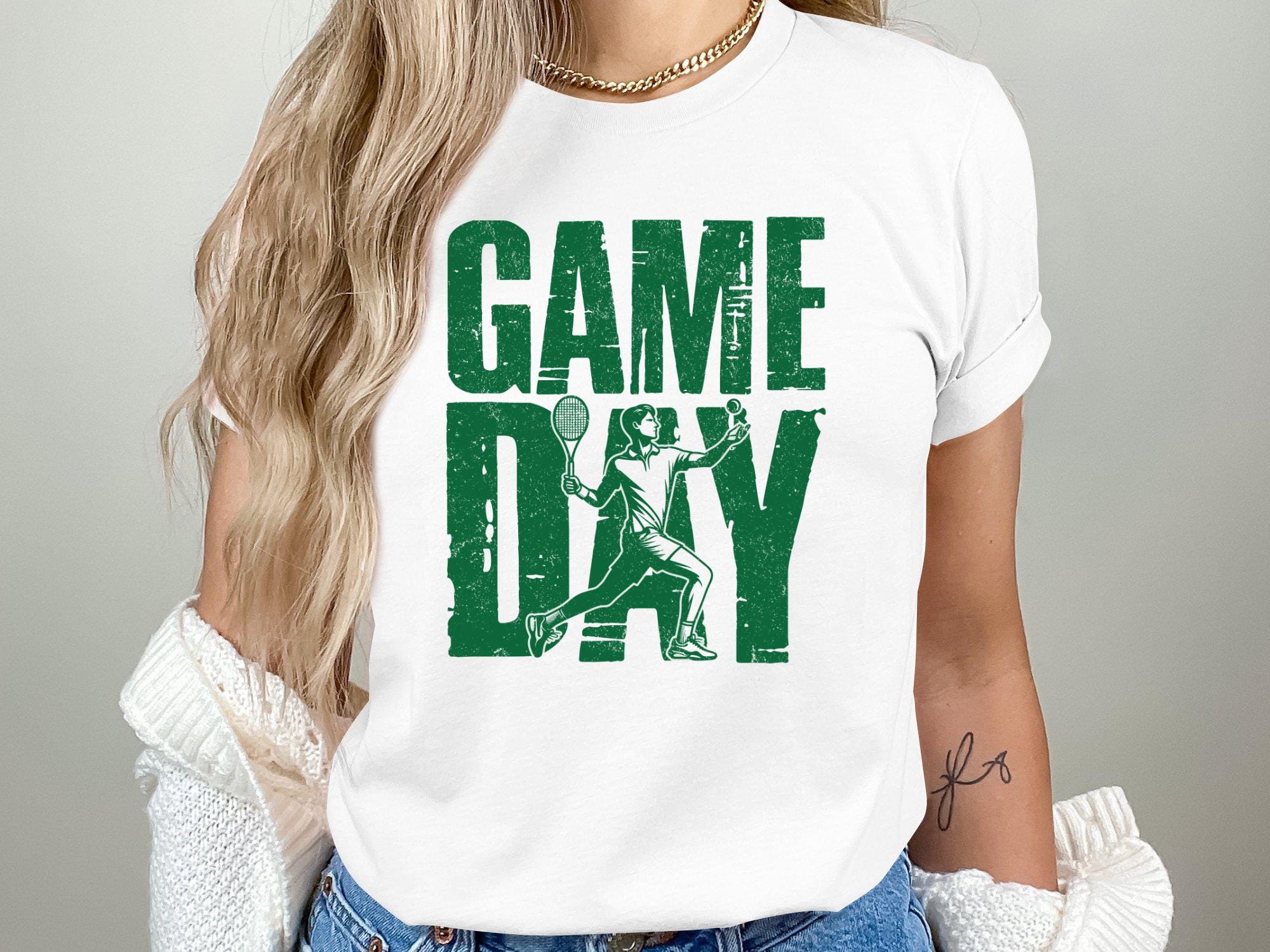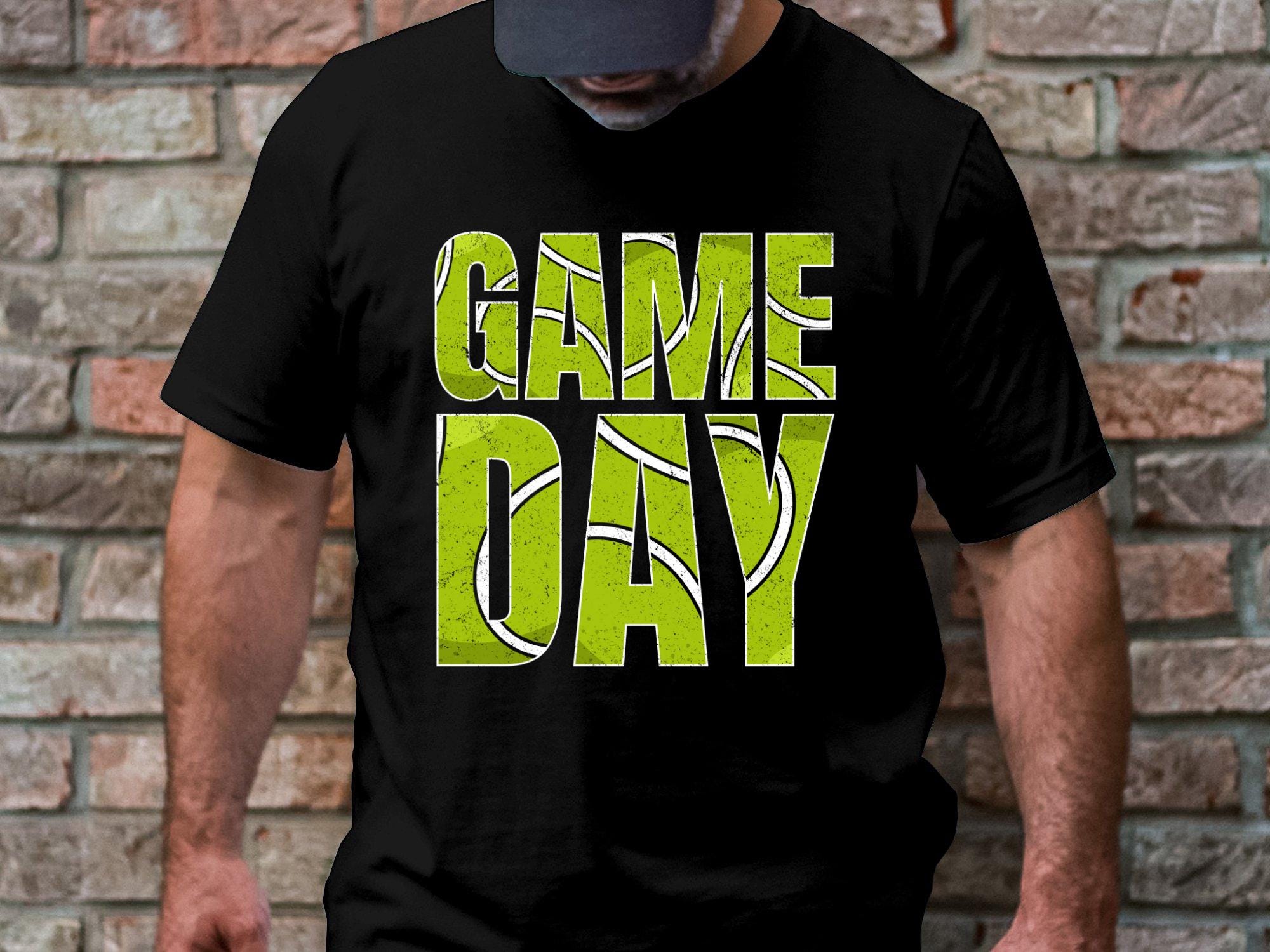 Bold tennis typography artwork featuring the quote "GAME DAY" with a distressed sporty style inspired by tennis court lines. Perfect for tennis fans, match day projects, sublimation prints, posters, decals, mugs, and apparel artwork.