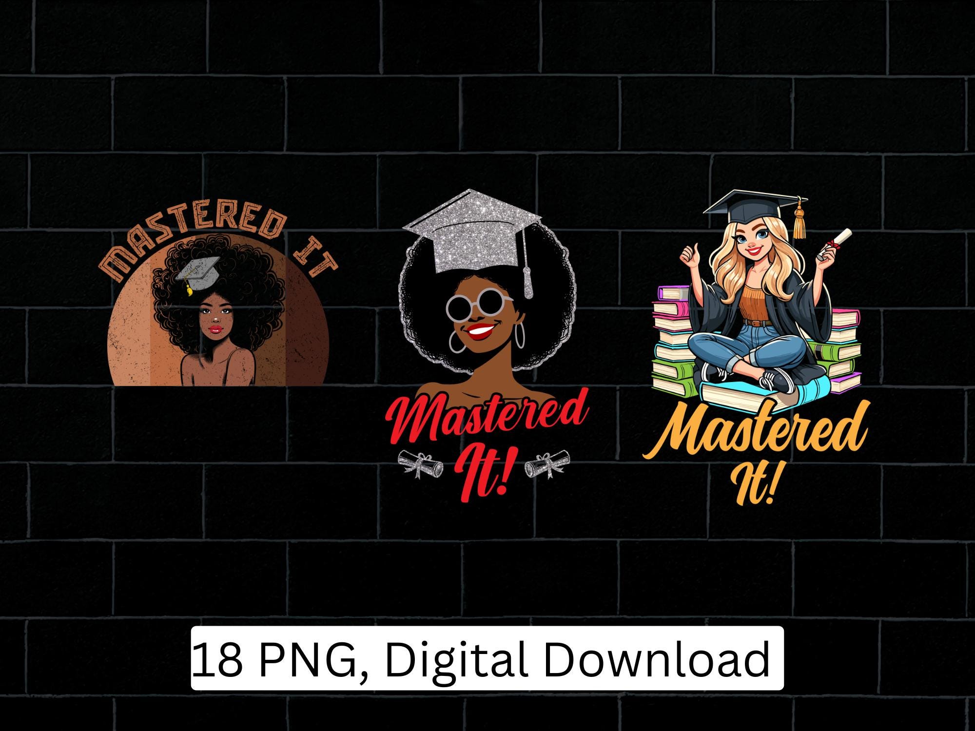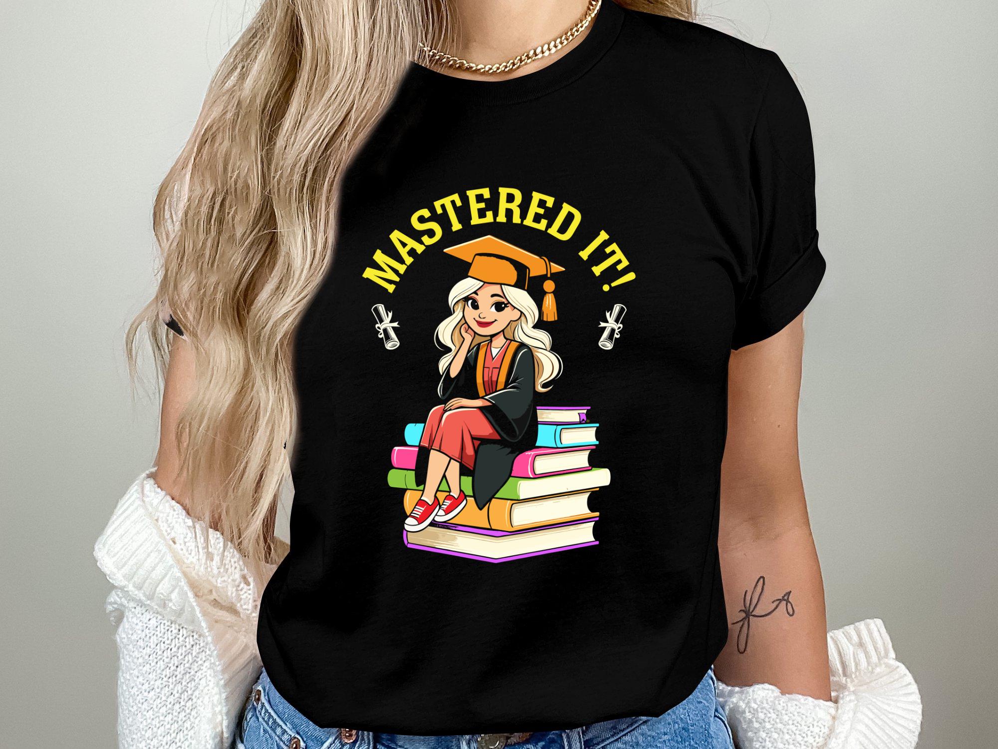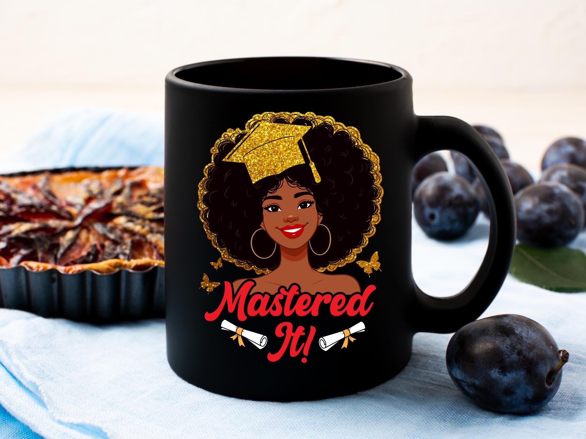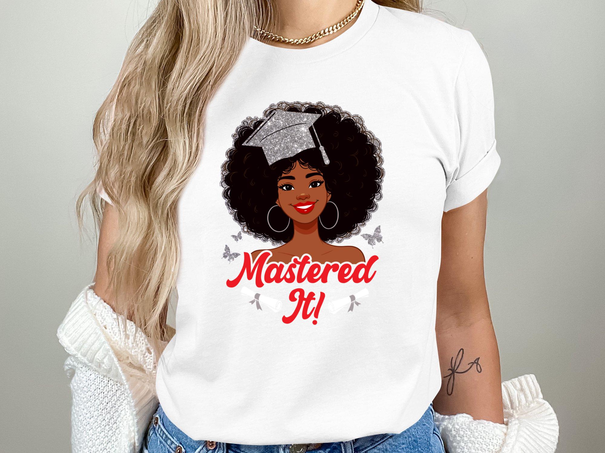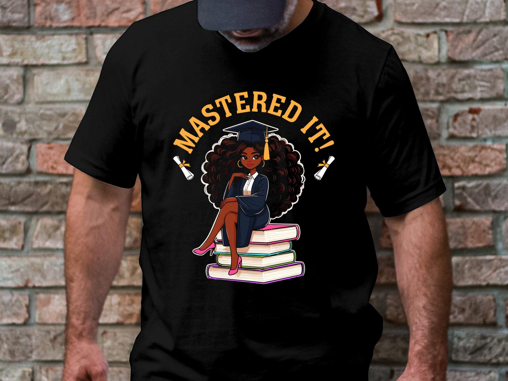 Celebrate success with this bold "Mastered It!" graduation illustration featuring a confident afro woman graduate. Perfect for shirts, hoodies, mugs, posters, stickers, and creative DIY projects. A stylish and empowering graphic ideal for grads, students, and proud achievement moments.