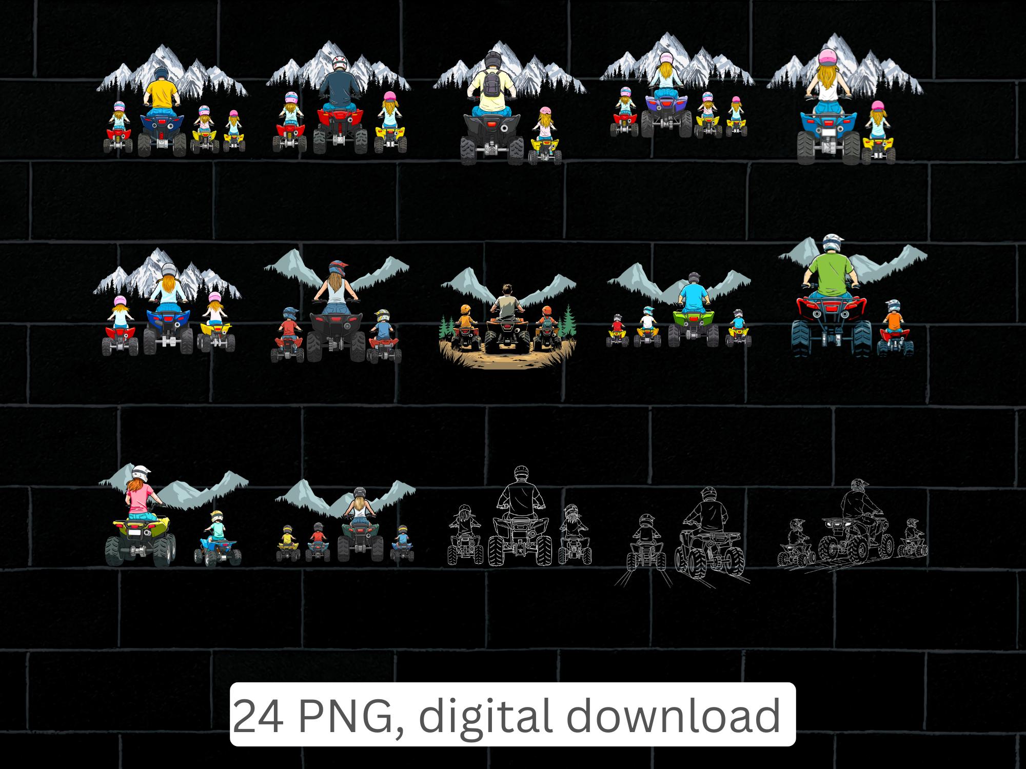 Embrace the thrill of the great outdoors with this ultimate Adventure Family Bundle. Featuring beautifully detailed illustrations of parents and children riding mountain bikes, dirt bikes, and ATVs against majestic mountain peaks, these designs are perfect for custom outdoor gear, family trip shirts, and adventurous home decor.