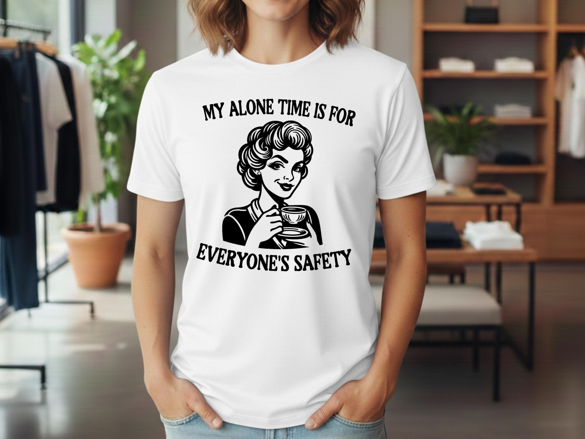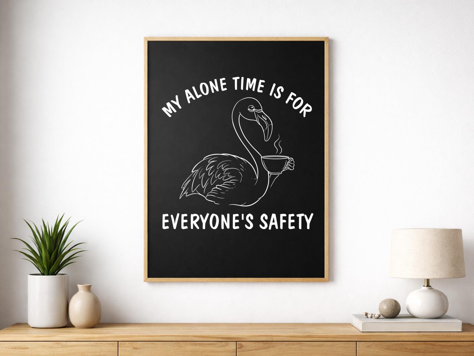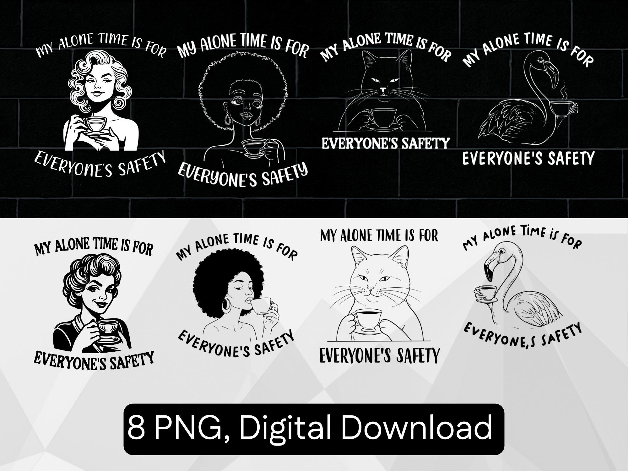 My Alone Time Is For Everyone's Safety, funny coffee lover quote artwork featuring stylish women, cat, and flamingo line art illustrations. Perfect for introverts, caffeine addicts, and sarcastic humor fans. Great for shirts, mugs, stickers, and Cricut projects.