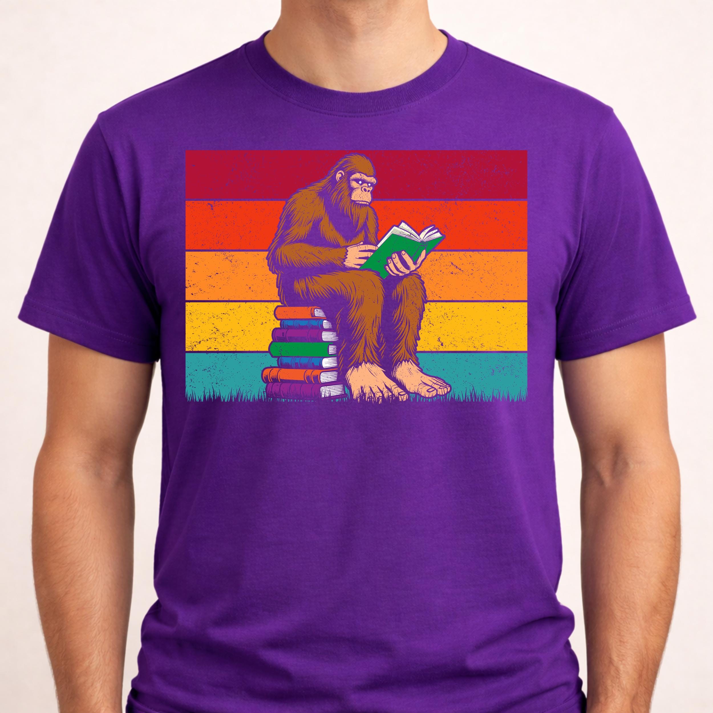 This high-resolution PNG digital download features Bigfoot reading a book while sitting on stacked books in a retro outdoor style. Ideal for sublimation, Cricut crafts, stickers, apparel graphics, tumblers, mugs, and printable projects.