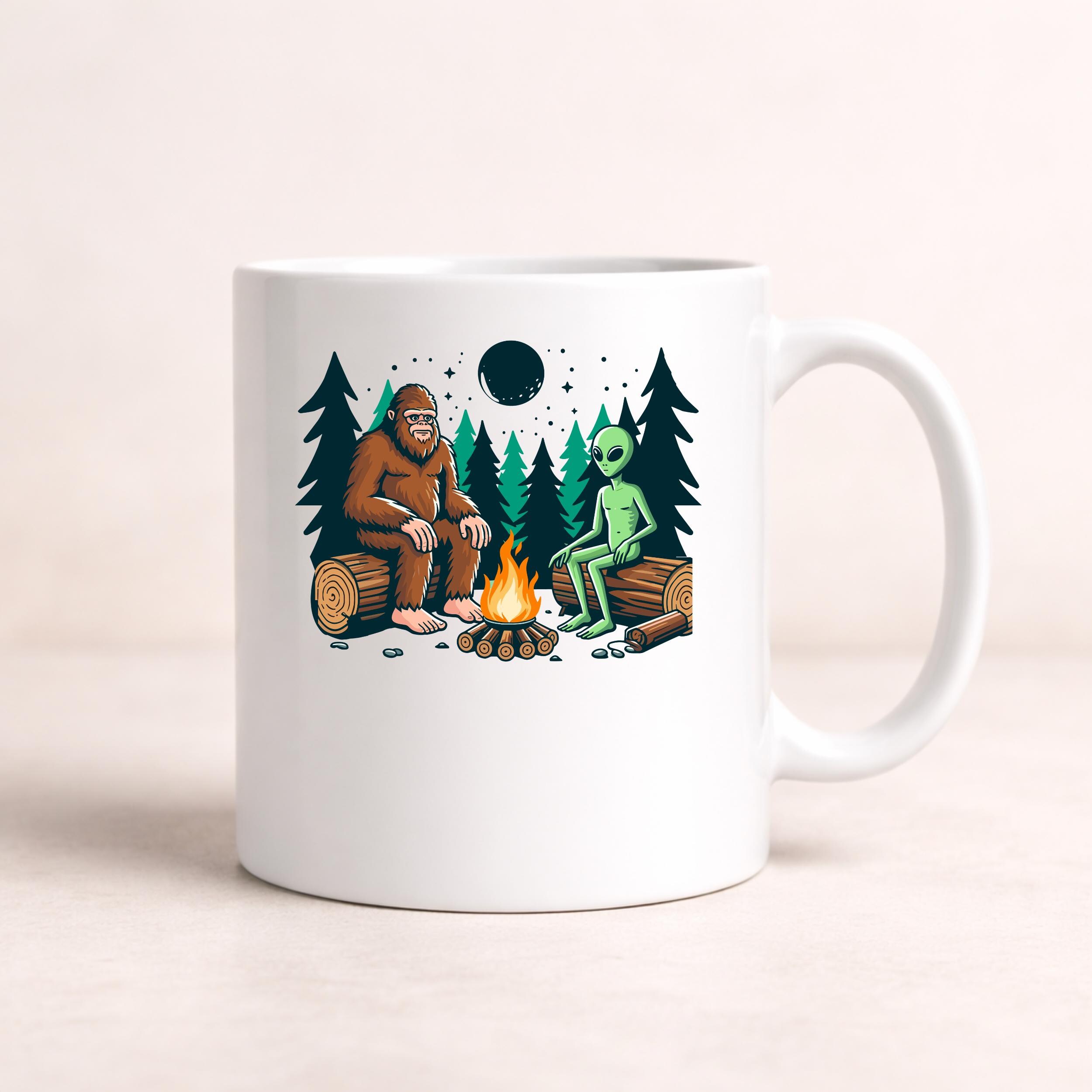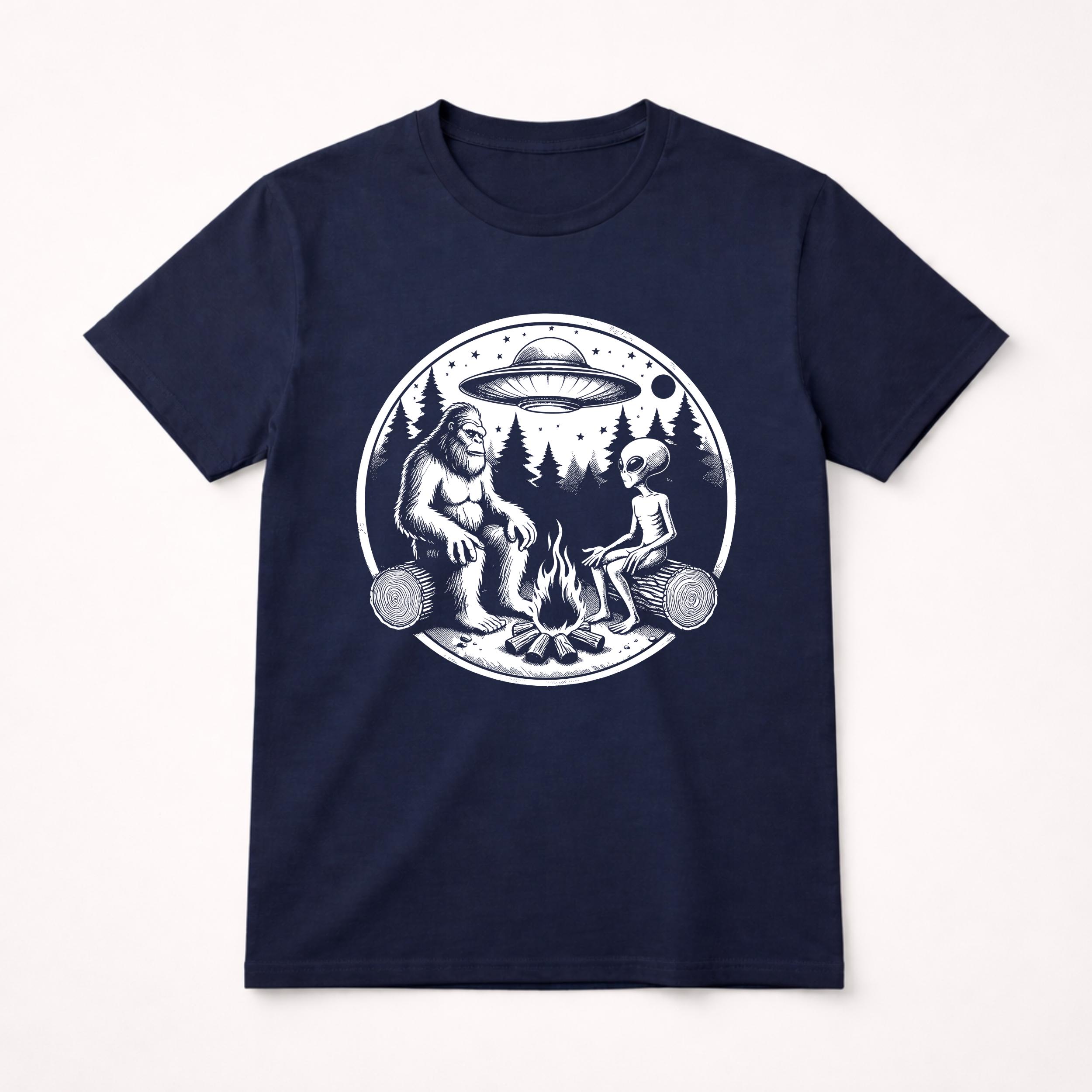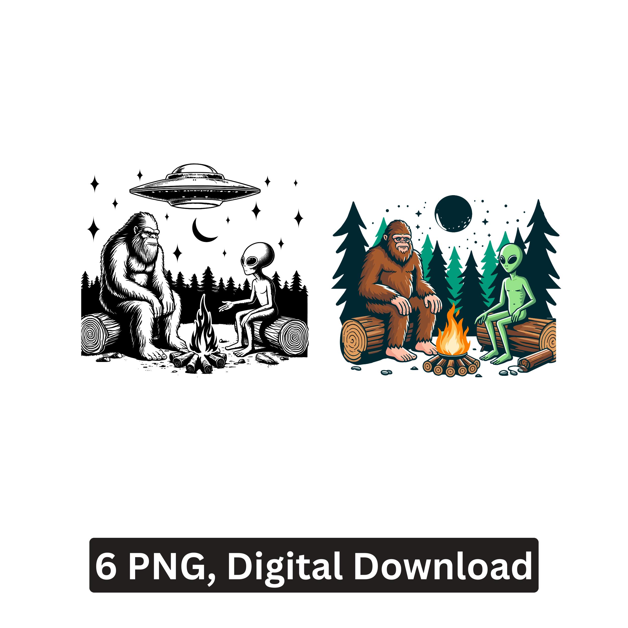 This high-resolution PNG digital download features Bigfoot and an alien sitting by a campfire in the forest under a UFO and moon. Ideal for sublimation, Cricut crafts, stickers, apparel graphics, tumblers, mugs, and printable projects.