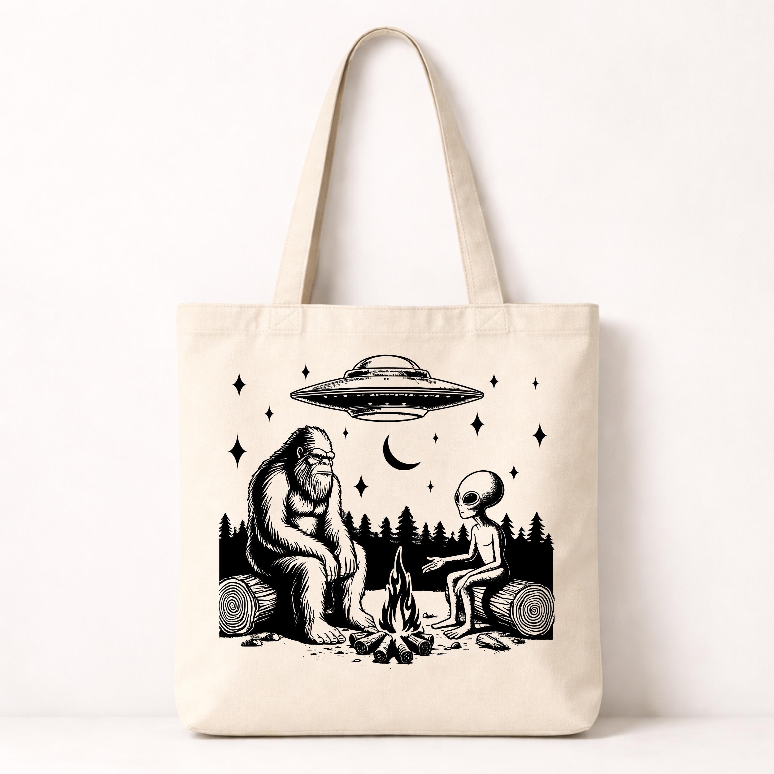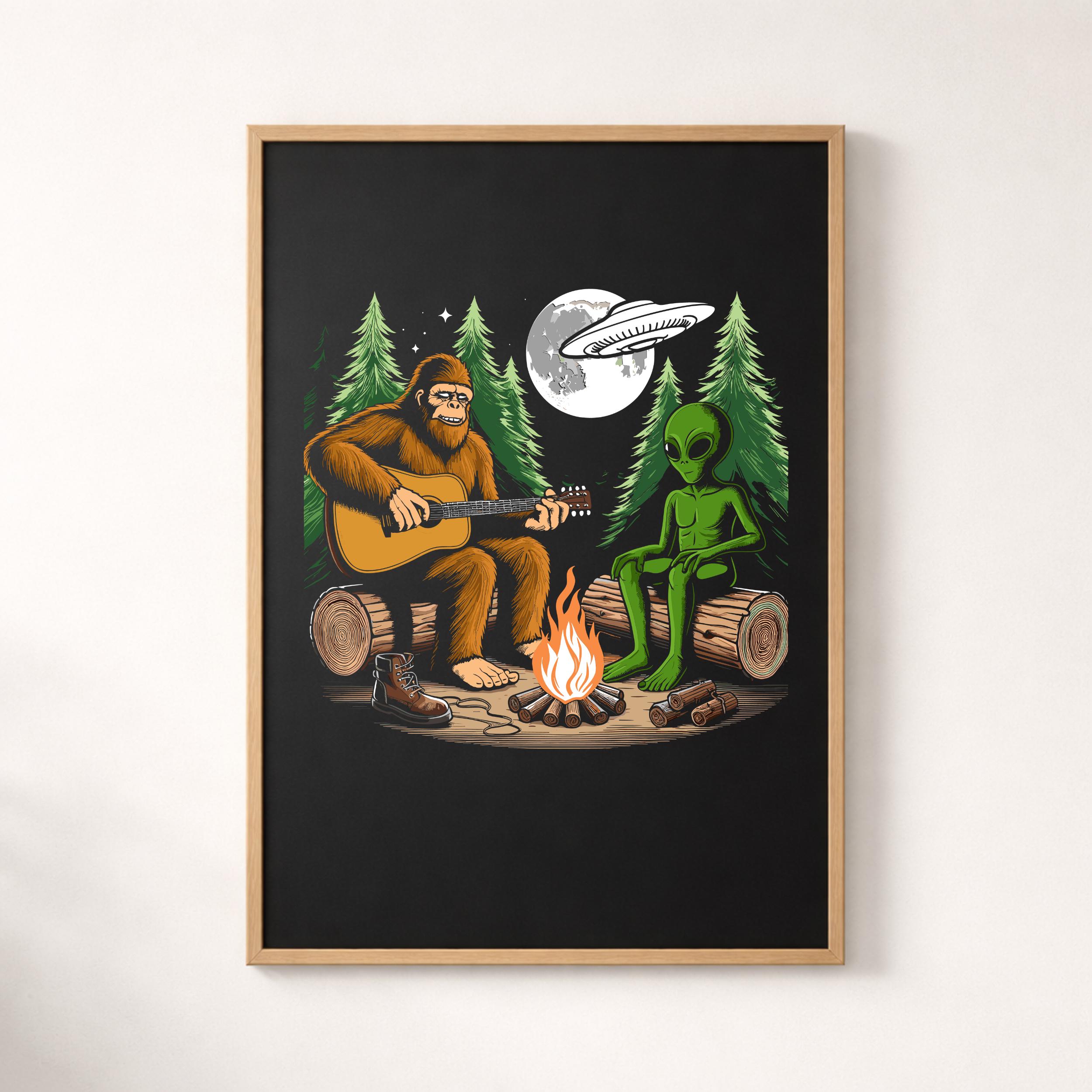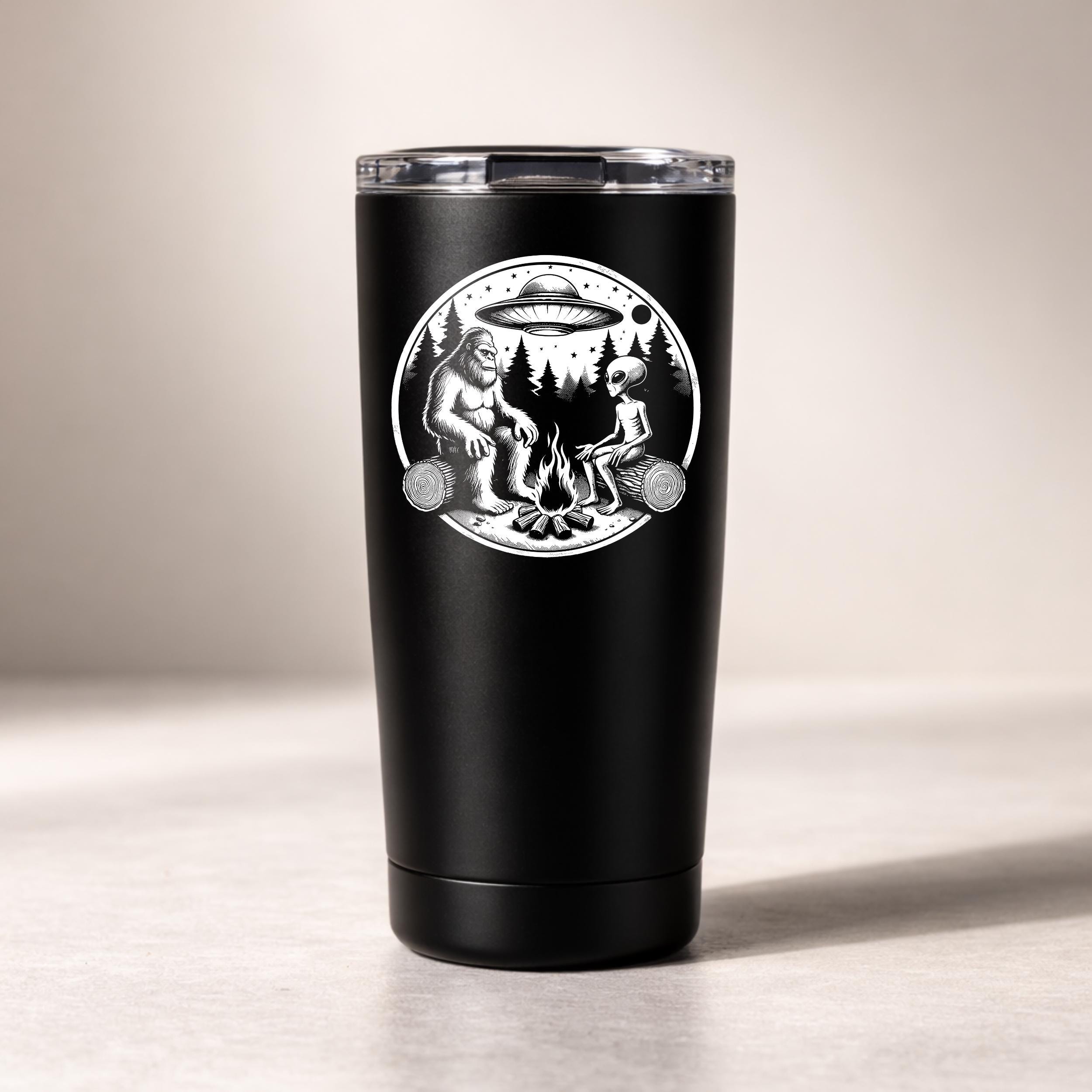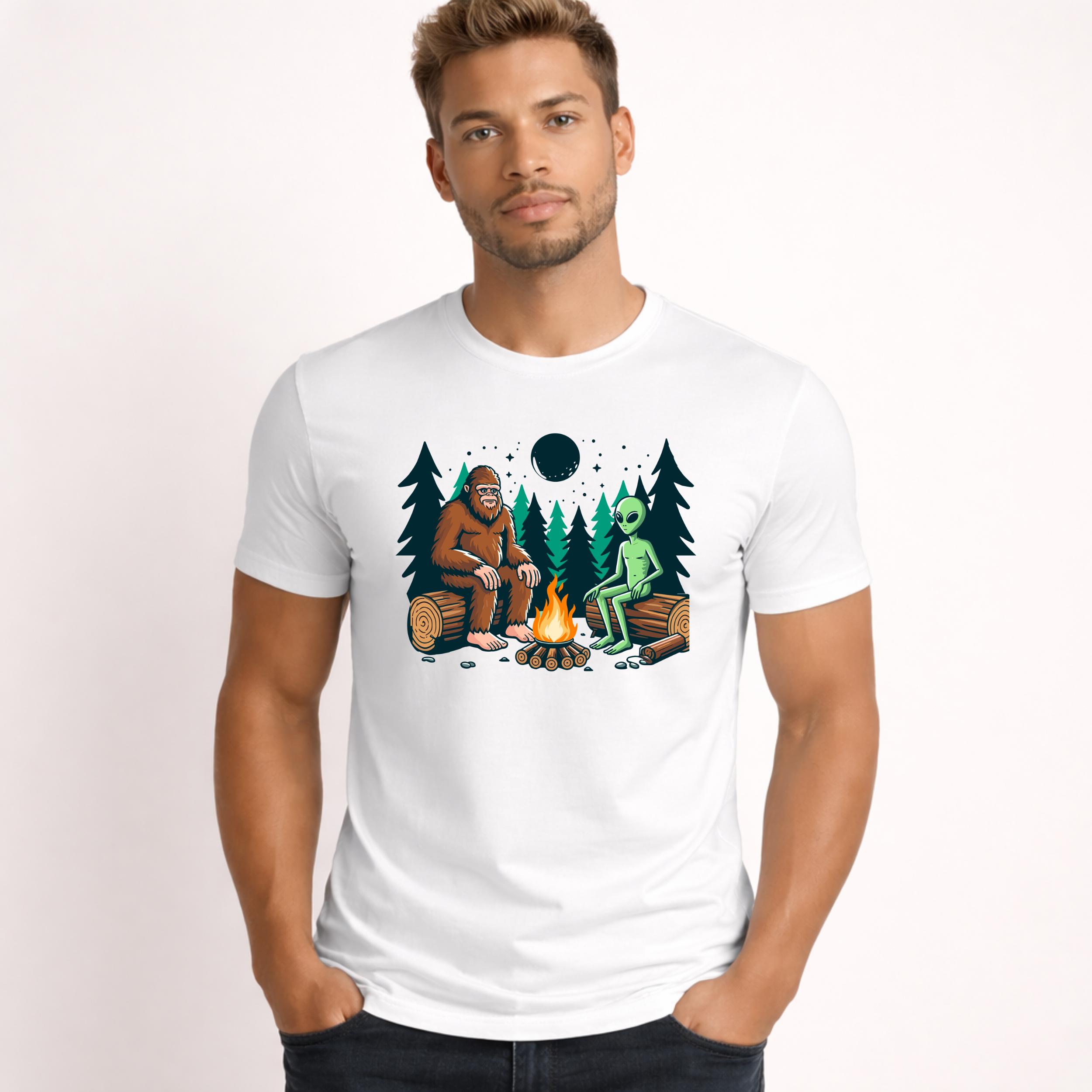 This high-resolution PNG digital download features Bigfoot and an alien sitting by a campfire in the forest under a UFO and moon. Ideal for sublimation, Cricut crafts, stickers, apparel graphics, tumblers, mugs, and printable projects.