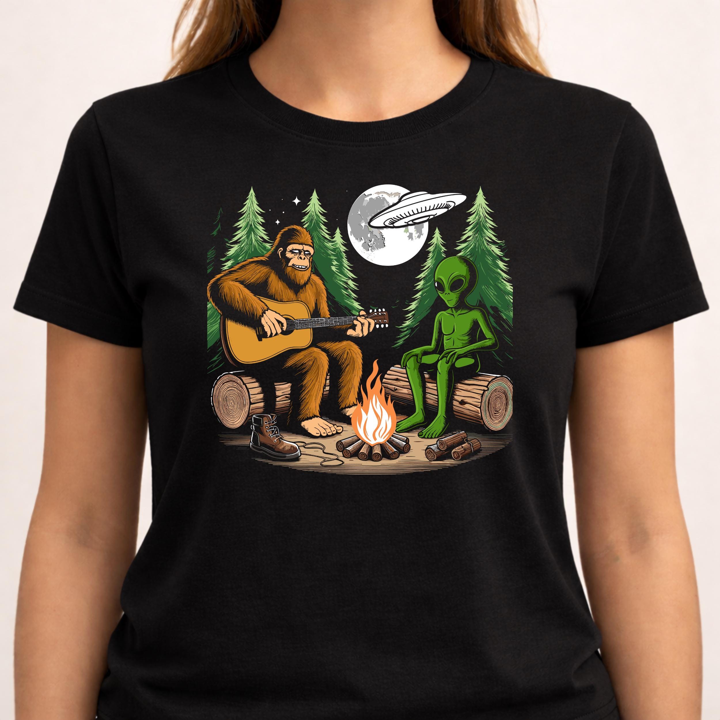Funny Bigfoot and alien campfire PNG digital download featuring a mysterious forest night scene with UFO and Sasquatch. Perfect for sublimation, Cricut crafts, shirts, mugs, stickers, and printing projects for sci-fi lovers and Bigfoot fans.