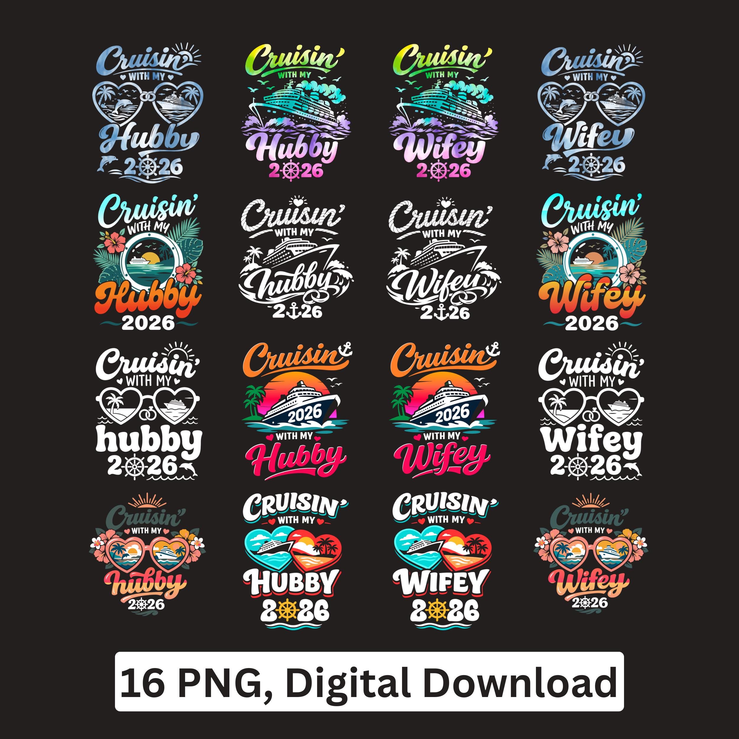 Cruisin with my Hubby and Cruisin with my Wifey 2026 PNG bundle for cruise couples. Perfect for sublimation, Cricut crafts, shirts, mugs, stickers, and printing projects for vacation lovers.
