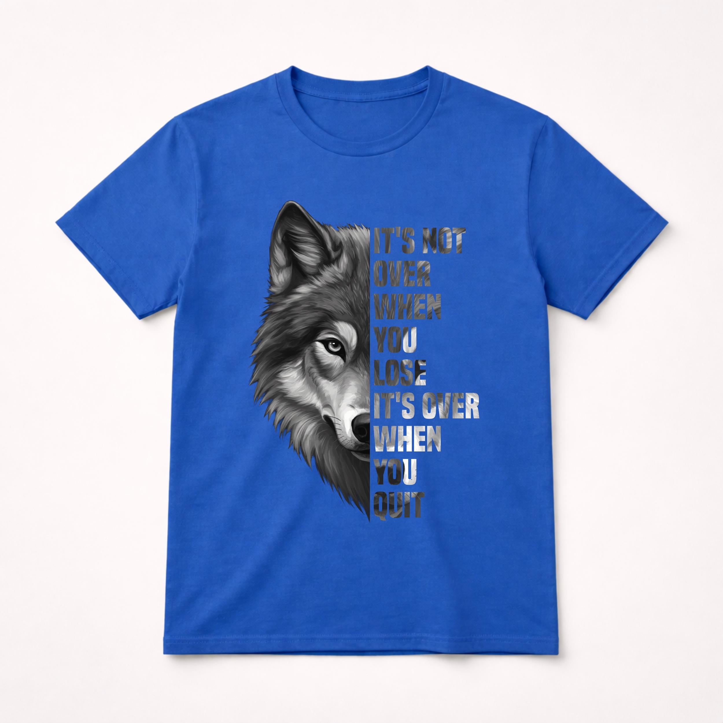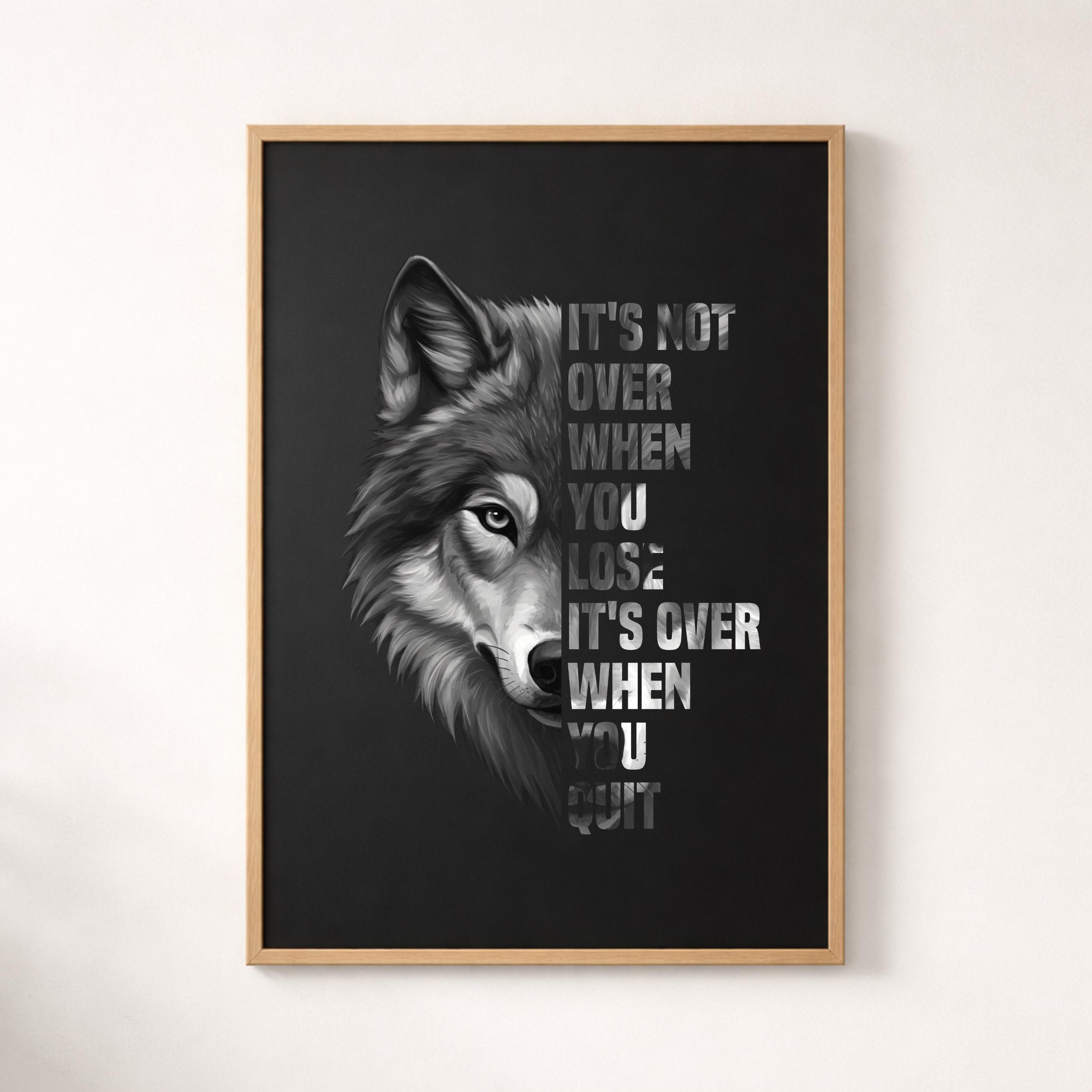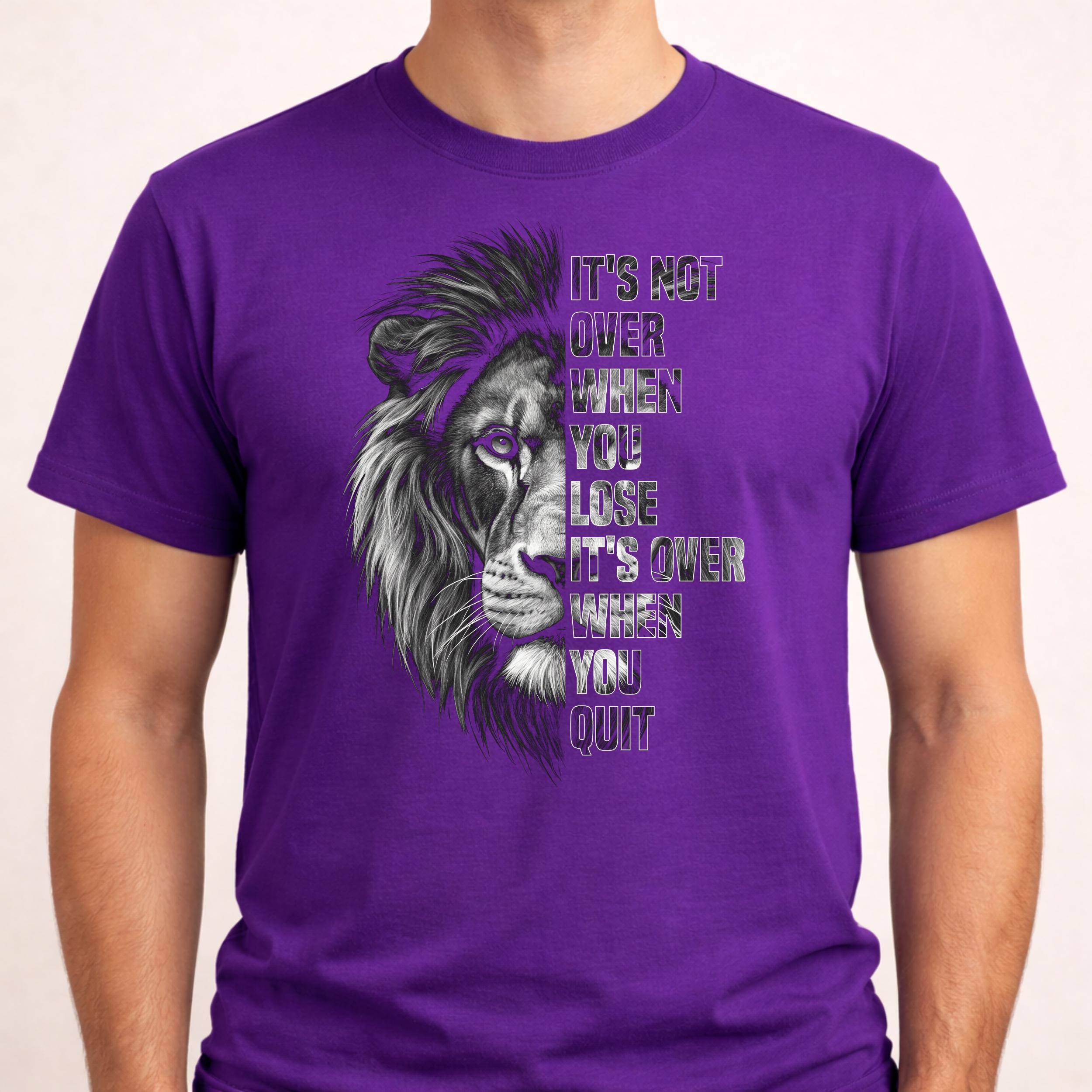 “It’s Not Over When You Lose It’s Over When You Quit” motivational animal design PNG. Features lion, wolf, and sunflower visuals. Perfect for inspiration lovers. Ideal for sublimation, Cricut crafts, shirts, mugs, stickers, and printing projects.